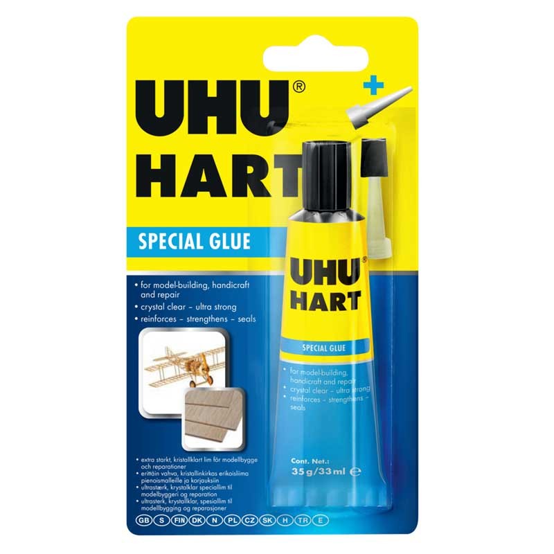 Klej modelarski UHU Hart o pojemności 35 g to doskonałe narzędzie do precyzyjnego montażu małych części w modelarstwie i do użytku domowego. Nadaje się idealnie do drewna, materiałów drewnopochodnych, metalu oraz różnych rodzajów tworzyw sztucznych, wykazując się solidną odpornością na temperatury od -30 °C do 90 °C.