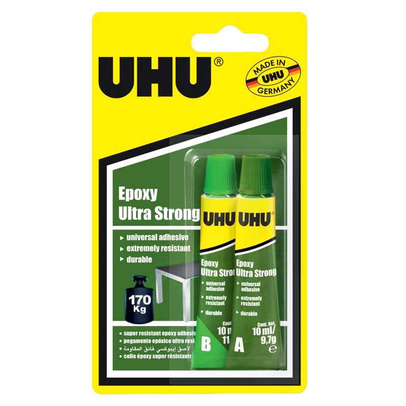 Klej UHU dwuskładnikowy Epoxy Ultra Strong to niezawodne narzędzie do naprawy i sklejania różnych materiałów. Dostarcza wyjątkowej siły klejenia, nadając się doskonale do metalu, ceramiki, szkła, pereł, kamieni szlachetnych oraz różnych materiałów syntetycznych, takich jak poliester, bakelit, sztywny polistyren i szkło akrylowe (Perspex®).