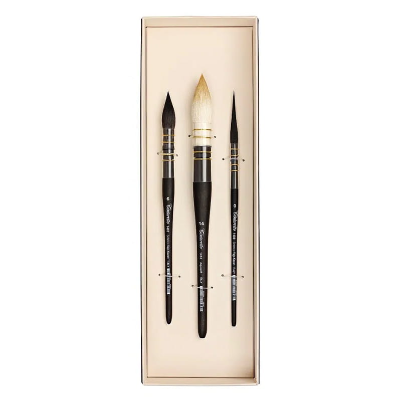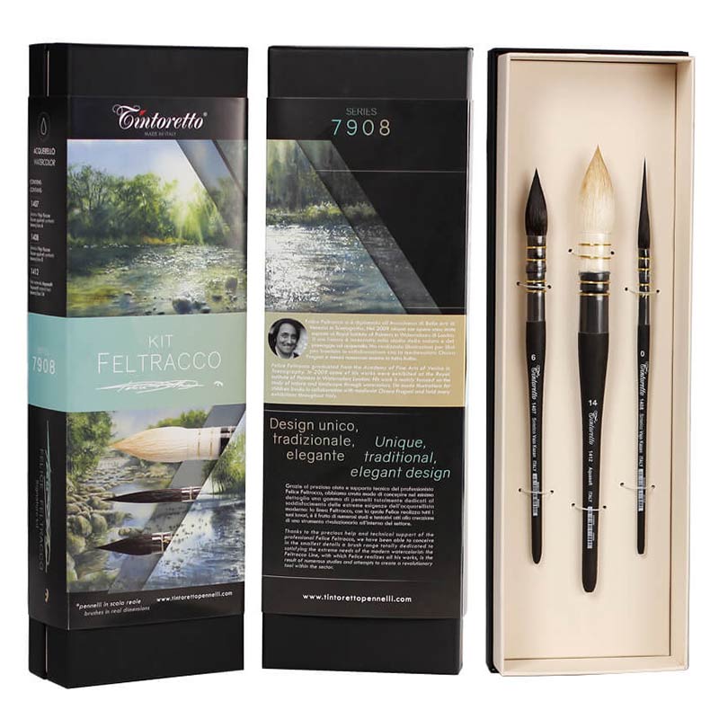 Zestaw pędzli Tintoretto nr 7908 Felice Feltracco to trzy doskonale zróżnicowane pędzle do akwareli stworzone we współpracy z włoskim akwarelistą Felice Feltracco. Twórczość Felice skupia się na badaniu natury i krajobrazu, a dzięki jego cennej pomocy, udało się opracować gamę pędzli dedykowaną zaspokojeniu ekstremalnych potrzeb współczesnego akwarelisty. Linia Feltracco to efekt licznych badań i prób stworzenia rewolucyjnych narzędzi w branży akwarelowej. Pędzle te idealnie nadadzą się do malarstwa realistycznego natury i krajobrazu. Zestaw ten jest doskonały dla pasjonatów akwareli i stanowi świetny prezent dla artysty.