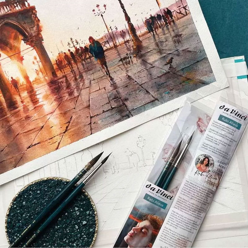 Zestaw pędzli powstały we współpracy ze znaną akwarelistką Rabi Alieva zawiera dwa ulubione pędzle artystki – mop French Quill Cosmotop Mix B w rozmiarze 2 oraz pędzel Casaneo 5599 w rozmiarze 6.