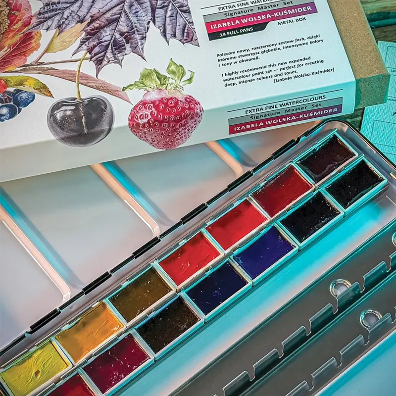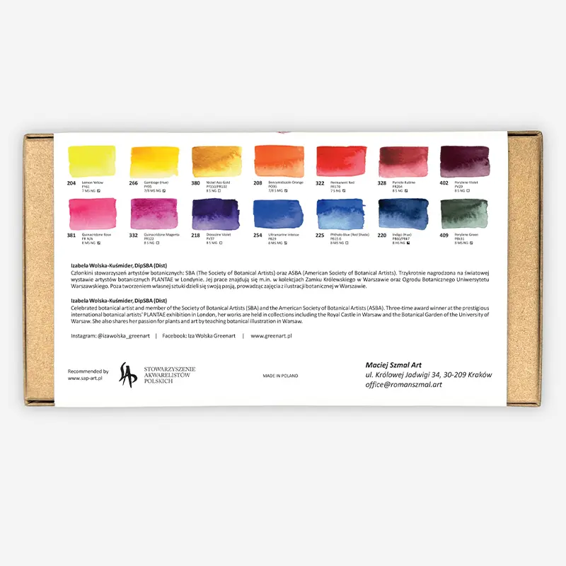 To jednak nie tylko zmiana wizualna. Wspólnie z artystką paleta została rozszerzona z 12 do 14 kolorów i uzupełniona o najnowsze odcienie, dzięki czemu uzyskano jeszcze bardziej kompletną i przemyślaną bazę do malarstwa botanicznego. Starannie dobrane pigmenty umożliwiają wierne odwzorowanie barw natury, budowanie subtelnych przejść tonalnych oraz szerokiej gamy zieleni i odcieni ziemi.