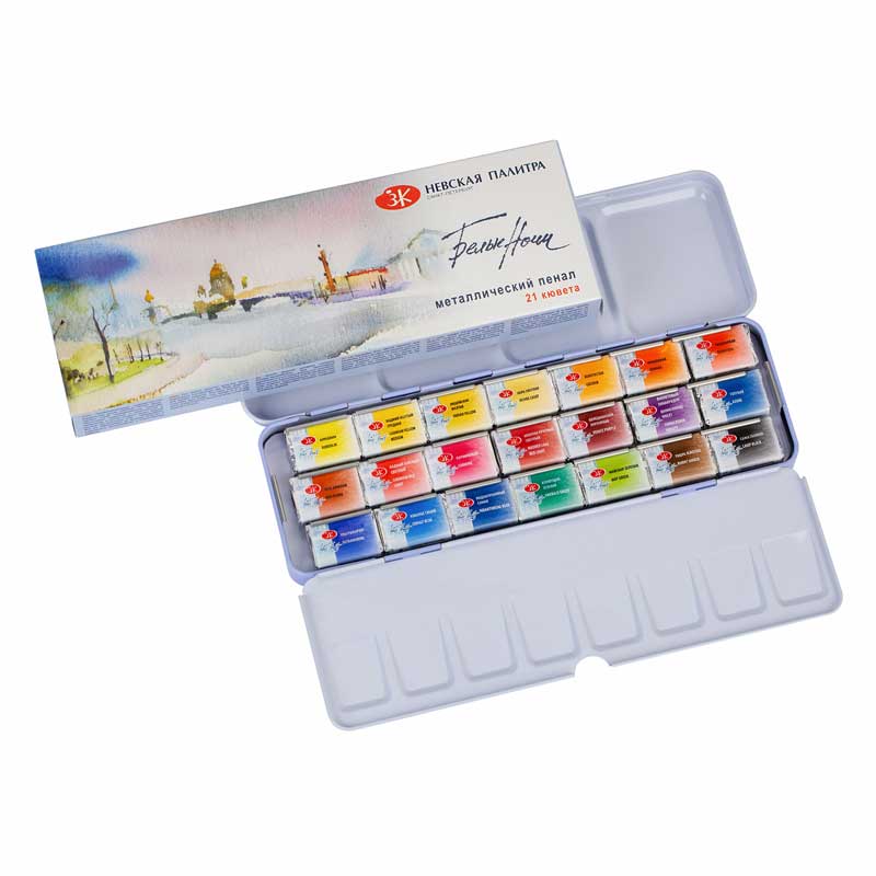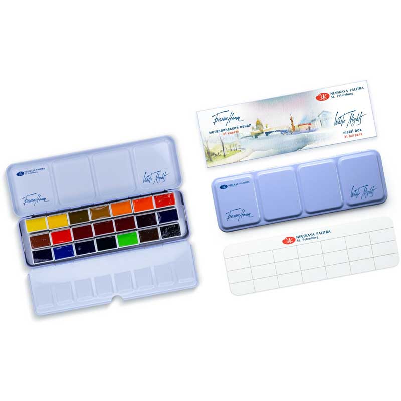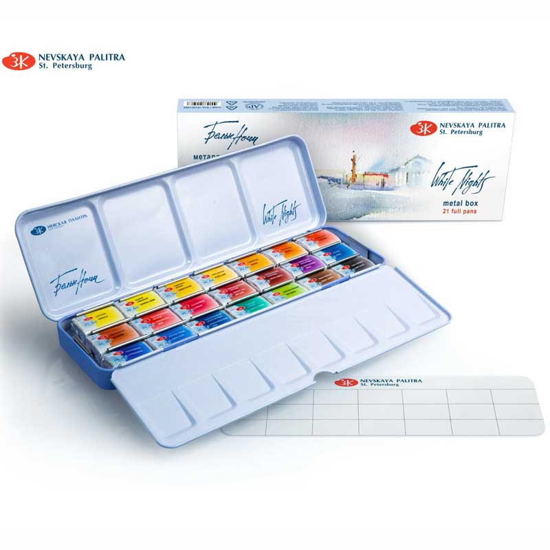 Akwarele Białe Noce (White Nights) to profesjonalne rosyjskie farby wodne produkowane przez firmę Nevskya Palitra, które składają się z drobno zmielonych, skoncentrowanych pigmentów, dzięki którym oferują świetliste, intensywne, transparentne kolory. Dzięki dodatkowi gumy arabskiej z żywicy akacjowej, farby akwarelowe Białe Noce nie pękają i są wysoce światłoodporne, dzięki czemu wykonane nimi prace nie blakną przez długie lata.