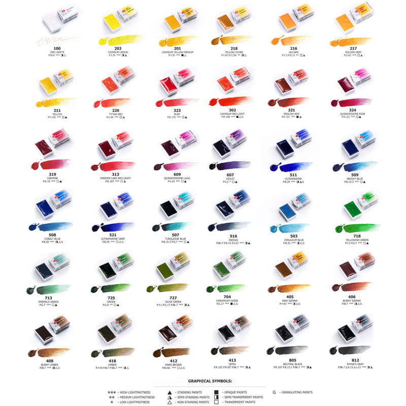Farby akwarelowe Białe Noce zdobyły światową sławę dzięki swojej niepowtarzalnej jakości. Wysokiej jakości pigmenty są połączone z wypełniaczami w spoiwie, zawierającym wodny roztwór gumy arabskiej, dekstrynu, plastyfikatora, środków zmniejszających napięcie powierzchniowe i środków antyseptycznych. Akwarele Białe Noce łatwo rozprowadzają się po powierzchni papieru, zachowując intensywny kolor nawet przy użyciu dużej ilości wody.