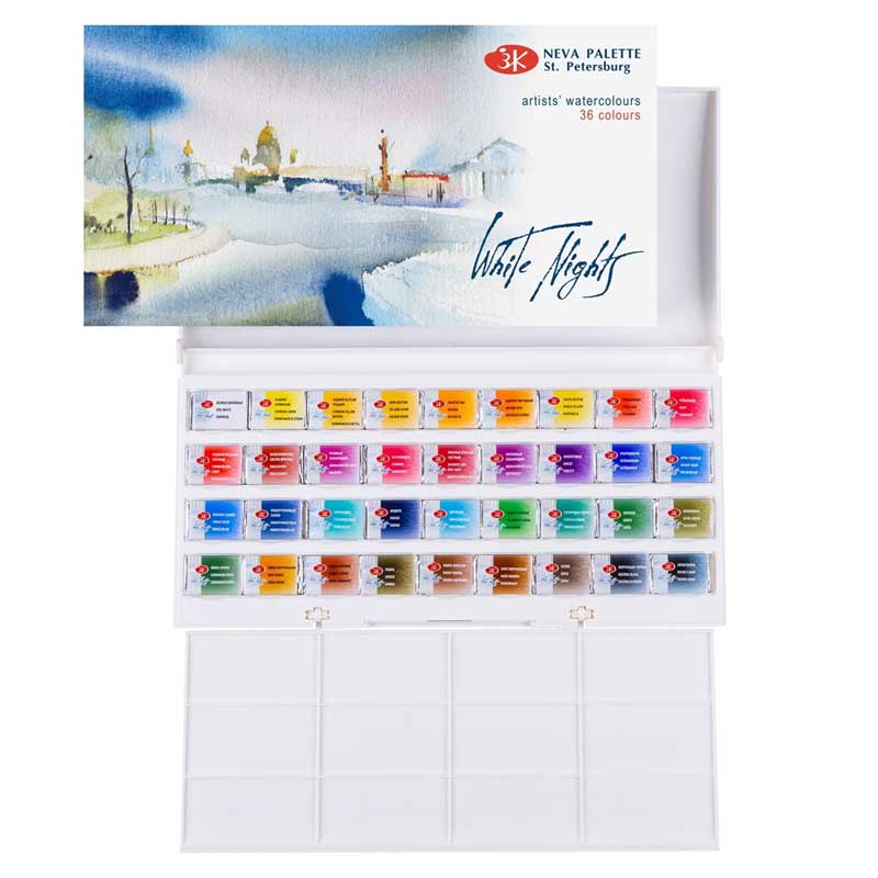 Akwarele Białe Noce (White Nights) to profesjonalne rosyjskie farby wodne produkowane przez firmę Nevskya Palitra, które składają się z drobno zmielonych, skoncentrowanych pigmentów, dzięki którym oferują świetliste, intensywne, transparentne kolory. Dzięki dodatkowi gumy arabskiej z żywicy akacjowej, farby akwarelowe Białe Noce nie pękają i są wysoce światłoodporne, dzięki czemu wykonane nimi prace nie blakną przez długie lata.