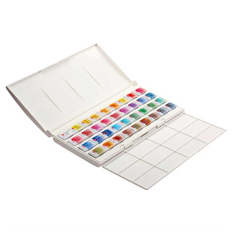 Farby są zapakowane w lekką, plastikową kasetkę idealną do zabrania ze sobą w podróż.
