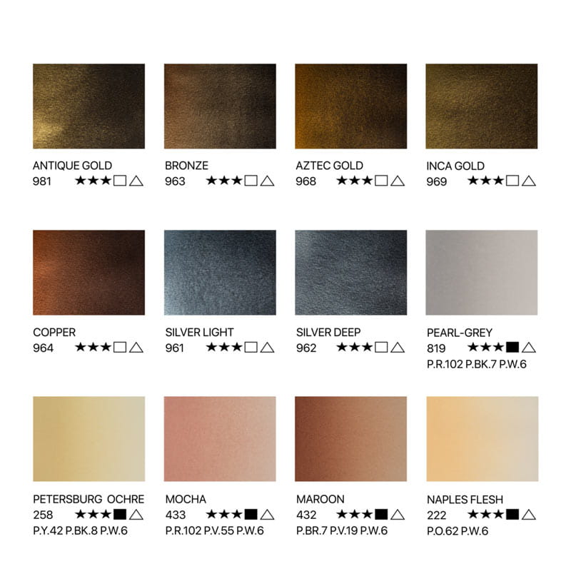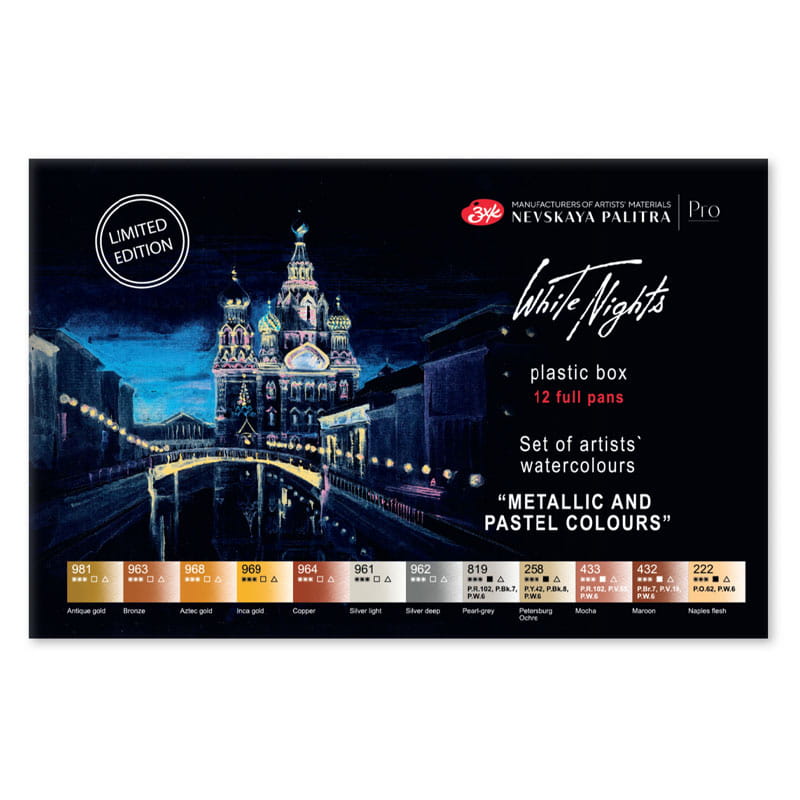 Zestaw akwareli White Nights Limited Edition Kolory metaliczne i pastelowe: 7 odcieni metalicznych i 5 pastelowych.