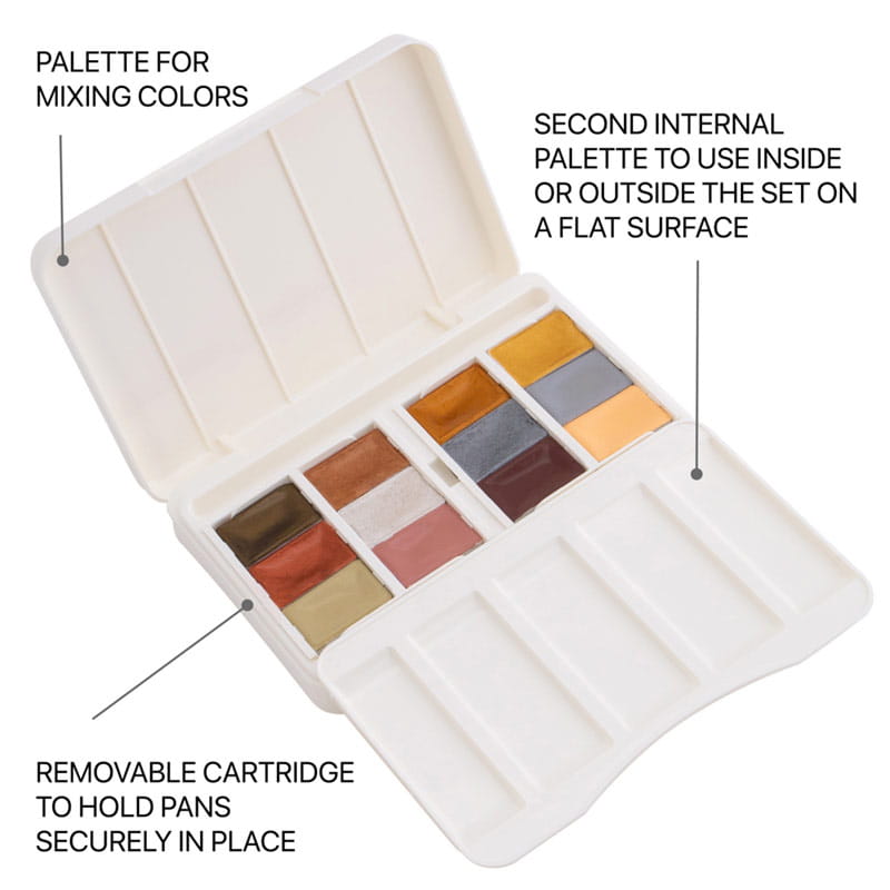 Plastikową kasetę można wygodnie zabrać w plener, a kostki są bezpiecznie zamocowane, dodatkowo w kasetce znajdują się dwie paletki do mieszania kolorów. Połyskujący metaliczny efekt można wykorzystać do tworzenia tekstur o głębokiej gradacji i jasnych akcentów.