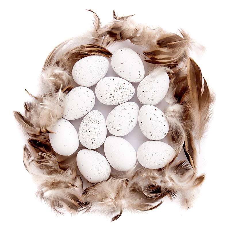 Jajeczka wielkanocne z dziurką dpCraft 12 szt. białe nakrapiane z piórkami