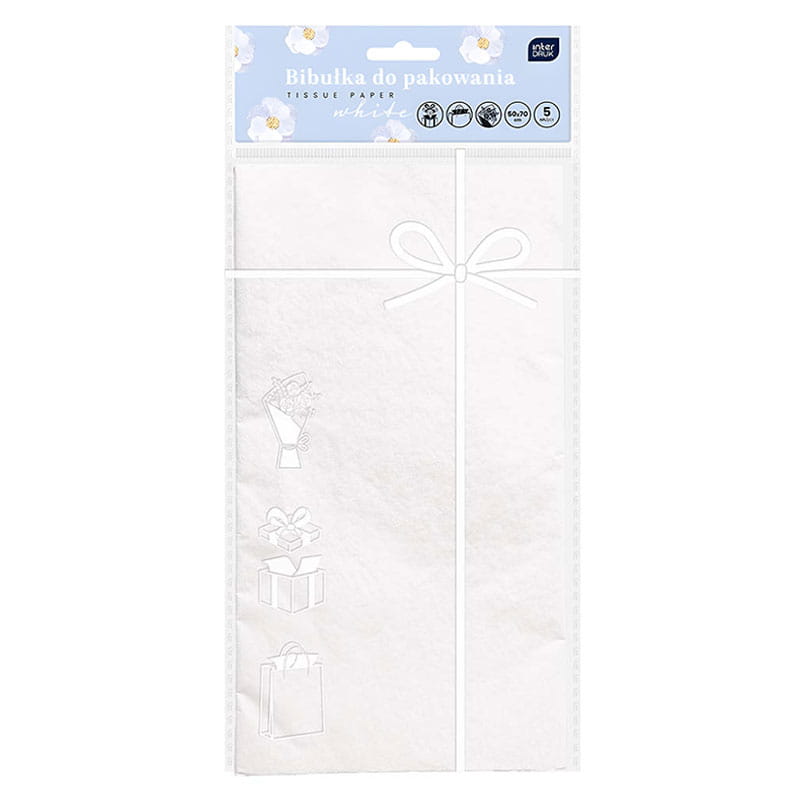 Opakowanie zawiera 5 sztuk bibuły o wymiarach 50 x 70 cm w białym kolorze.