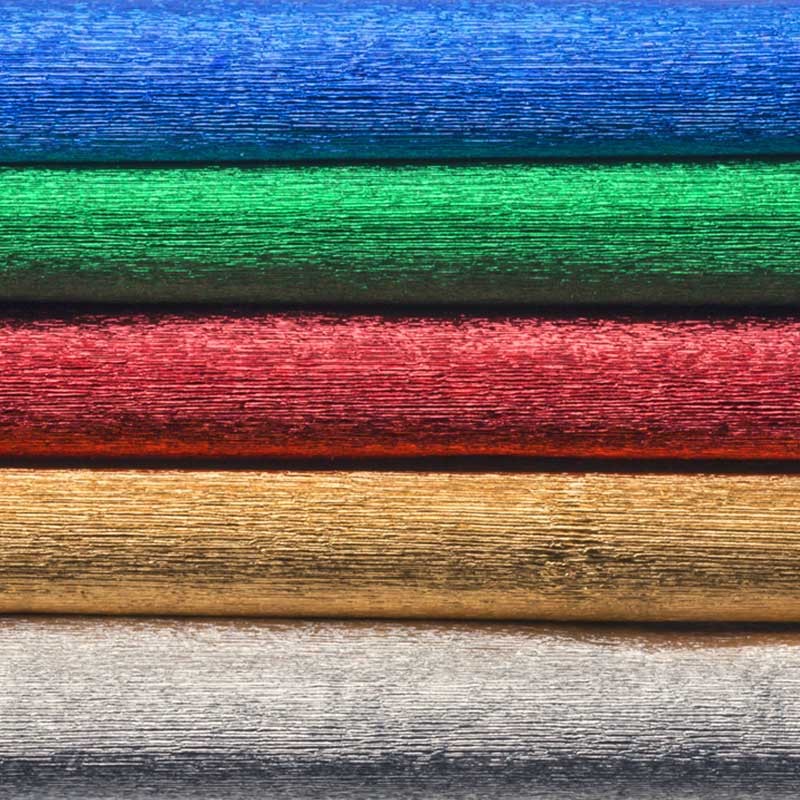 Bibuła marszczona w pięciu metalicznych kolorach: srebrnym, złotym, czerwonym, zielonym i niebieskim. Odpowiednia do pracy z dziećmi, sprawdzi się w projektach kreatywnych takich jak wycinanki, witraże, kwiaty, stroiki, kostiumy itd.
