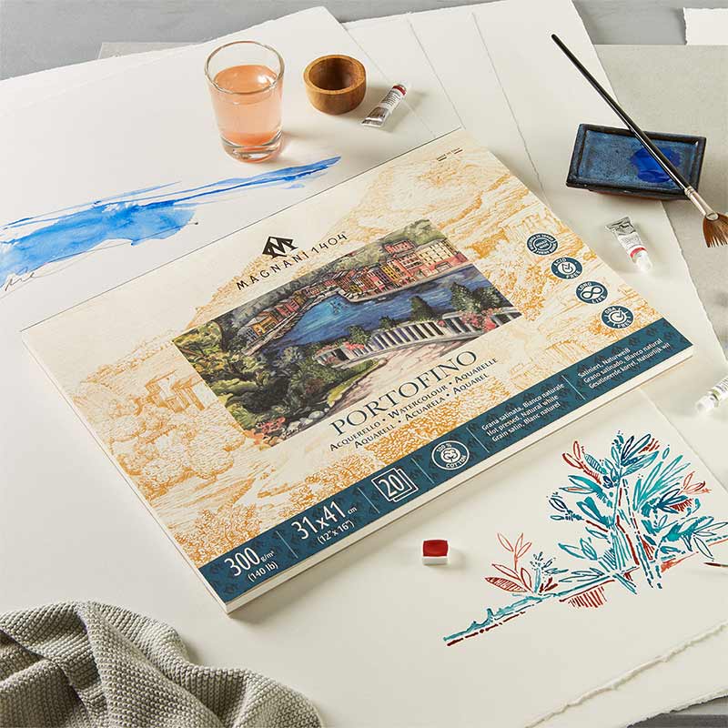 Blok akwarelowy cenionej, włoskiej firmy Magnani 1404. Zawiera papier akwarelowy 'PORTOFINO' - BAWEŁNA 100% - o gramaturze 300 g - Hot Press (gładki, niemal satynowy). To prestiżowy papier do akwareli wytwarzany tradycyjnymi metodami na cylindrycznych maszynach bębnowych. To jeden z papierów akwarelowych z najdłuższą historią wytwarzania, cieszący się nieskazitelną reputacją wśród akwarelistów.