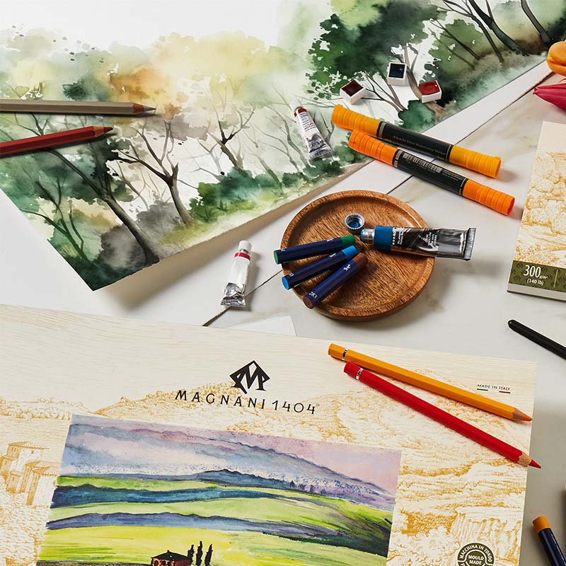 Blok cenionej, włoskiej firmy Magnani 1404. Zawiera papier do malarstwa i rysunku - jedna z najnowszych wersji papieru Magnani 1404 - ' ARTE MODERNA' - 100% bawełny - 300 gram. Jest to papier o wszechstronnym przeznaczeniu tzw. Mix Media, w kolorze naturalnej bieli o delikatnej, piaskowej strukturze Natural Rough.