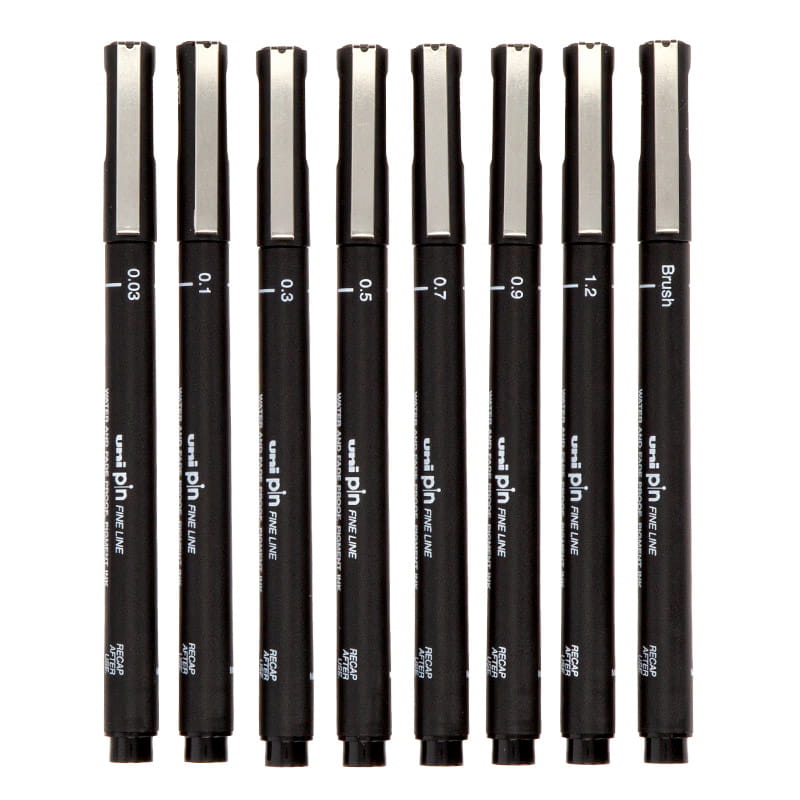 Grubości w zestawie: 0,03 mm, 0,1 mm, 0,3 mm, 0,5 mm, 0,7 mm, 0,9 mm, 1,2 mm brush. Wszystkie w kolorze głębokiej czerni.