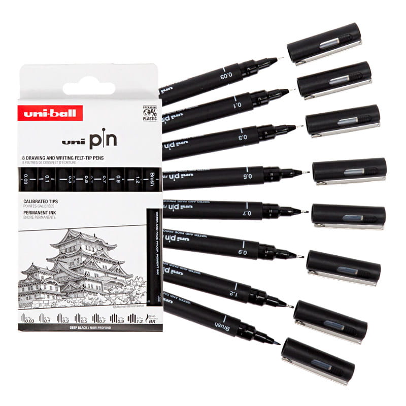 Zestaw profesjonalnych cienkopisów kreślarskich UNI PIN doskonały dla projektantów, grafików i artystów. Idealny do szkicowania i rysunku technicznego. Pisaki Uni Pin są wodoodporne, schną bardzo szybko i nie rozmazują się. Trwała i twarda końcówka fibrowa nie ulega rozwarstwieniu w miarę użytkowania.