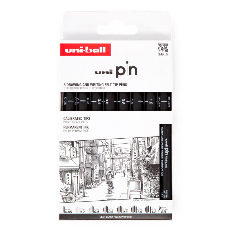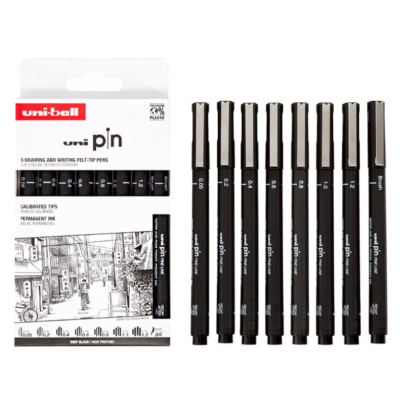 Zestaw profesjonalnych cienkopisów kreślarskich UNI PIN doskonały dla projektantów, grafików i artystów. Idealny do szkicowania i rysunku technicznego. Pisaki Uni Pin są wodoodporne, schną bardzo szybko i nie rozmazują się. Trwała i twarda końcówka fibrowa nie ulega rozwarstwieniu w miarę użytkowania.