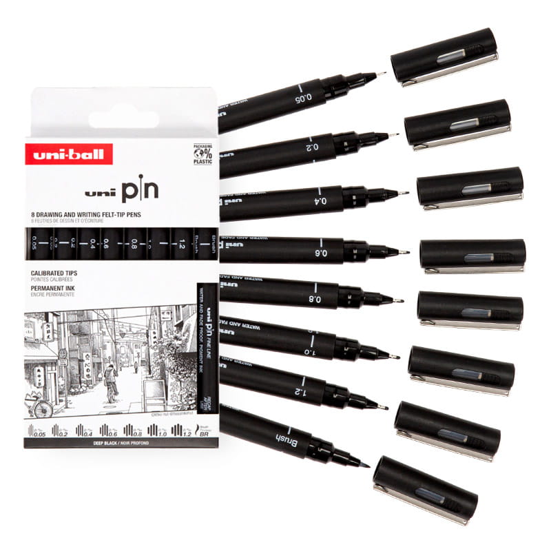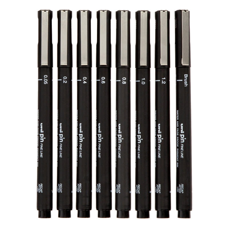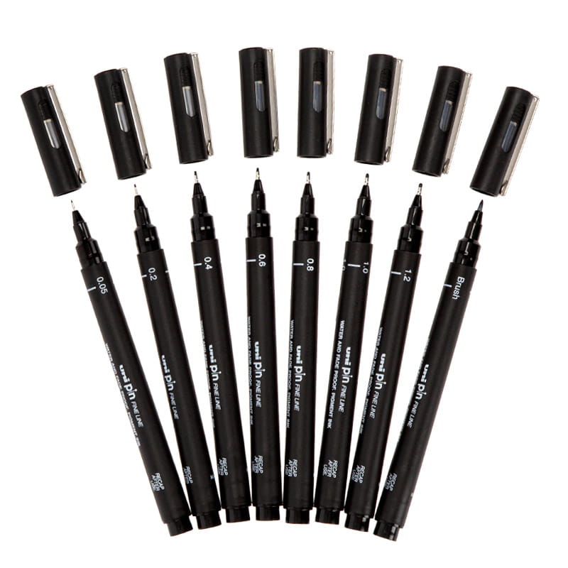 Grubości w zestawie: 0,05 mm, 0,2 mm, 0,4 mm, 0,6 mm, 0,8 mm, 1,0 mm, 1,2 mm brush.. Wszystkie w kolorze głębokiej czerni.