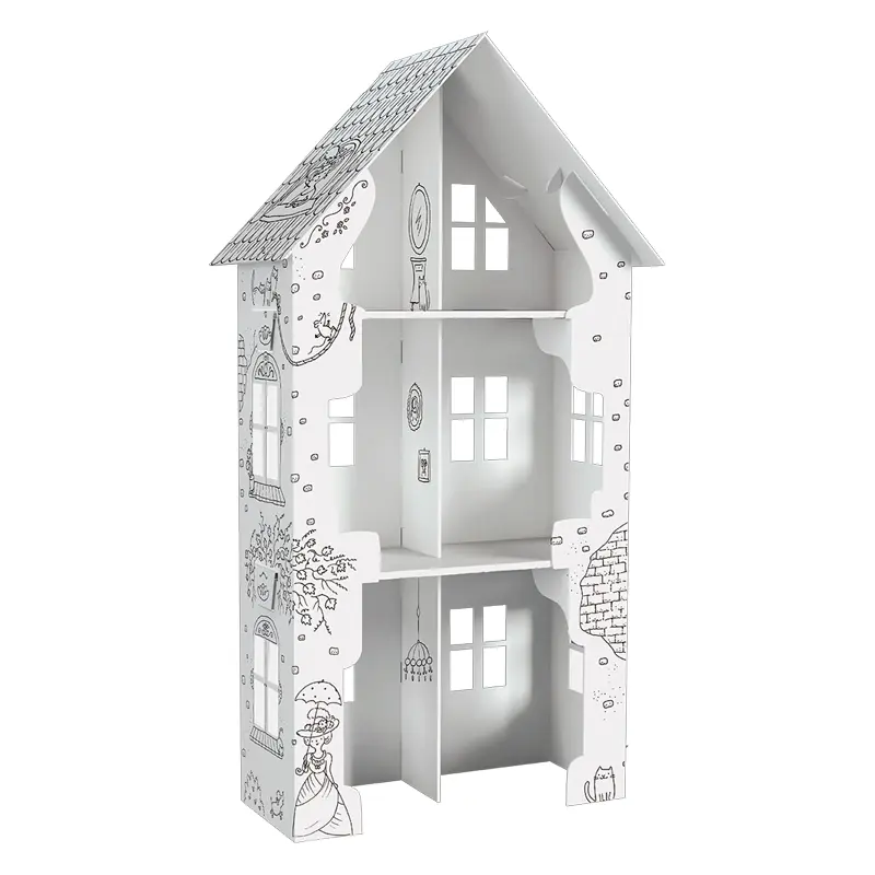 - Przestrzenna konstrukcja 3D: Wielopiętrowy dom kolorowanka dla dzieci z okienkami, półeczkami i otwartymi przestrzeniami, które uatrakcyjniają zabawę.