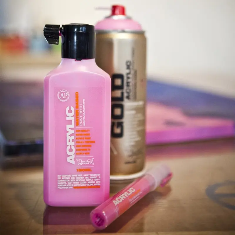 - Podkład: dla fluorescencyjnych kolorów konieczne jest gruntowanie powierzchni bielą (np. Montana Shock White). Wzmocni to efekt fluorescencji.