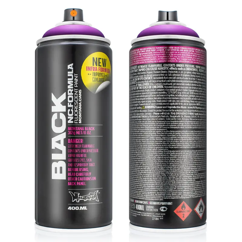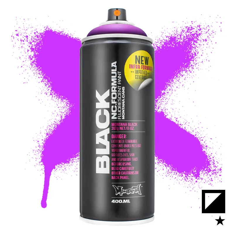 Montana BLACK INFRA to seria fluorescencyjnych farb w sprayu, opracowana z myślą o artystach, projektantach i twórcach graffiti. Paleta obejmuje sześć intensywnych, neonowych kolorów: INFRA Yellow, Orange, Red, Pink, Violet i Green. Dzięki wysokiej pigmentacji oraz szybkoschnącej formule na bazie żywicy nitrocelulozowej farby doskonale sprawdzają się podczas dynamicznego malowania, umożliwiając precyzyjną aplikację i szybkie nakładanie kolejnych warstw.