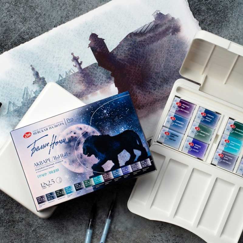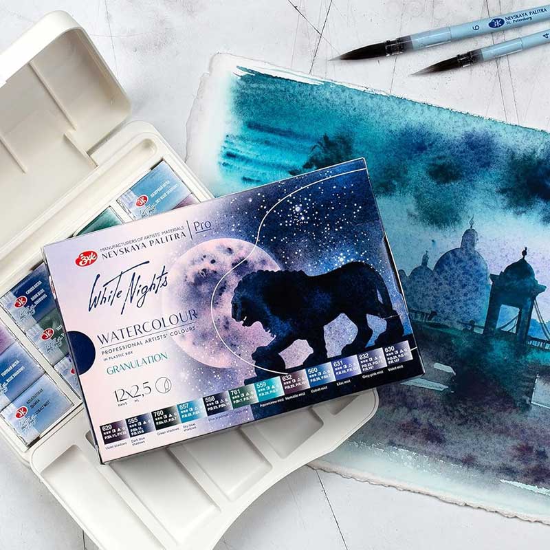 Akwarele Białe Noce (White Nights) to profesjonalne rosyjskie farby wodne produkowane przez firmę Nevskya Palitra, które składają się z drobno zmielonych, skoncentrowanych pigmentów, dzięki którym oferują świetliste, intensywne, transparentne kolory. Dzięki dodatkowi gumy arabskiej z żywicy akacjowej, farby akwarelowe Białe Noce nie pękają i są wysoce światłoodporne, dzięki czemu wykonane nimi prace nie blakną przez długie lata.