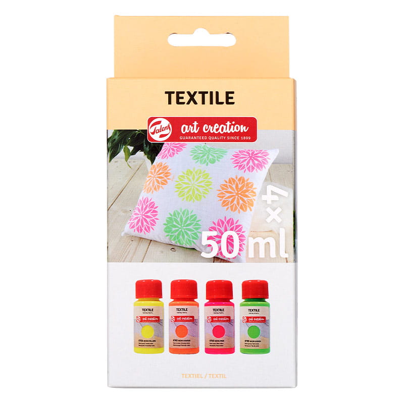 Wykorzystaj farby Talens Art Creation Textile do odnowienia swoich ubrań, akcesoriów i dekoracji wnętrz, takich jak poszewki na poduszki i zasłony. Zestaw oferuje 4 neonowe odcienie idealne do jasnych tkanin (z min. 50% bawełny), umożliwiając tworzenie personalizowanych projektów na tkaninach. Te farby doskonale sprawdzą się przy malowaniu poduszek, ubrań i zasłon, z możliwością wykorzystania ich z stemplami czy szablonami.