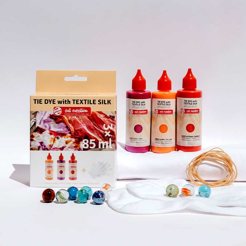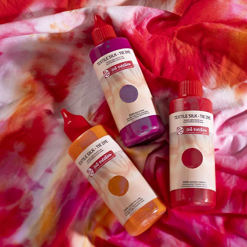 Spersonalizuj jedwab i inne jasne tkaniny za pomocą barwników Talens Art Creation Textile Silk. Zestaw barwników pozwala na całkowitą zmianę koloru odzieży i dodatków takich jak szaliki i T-shirty, ale także tekstylnych elementów wyposażenia wnętrz.