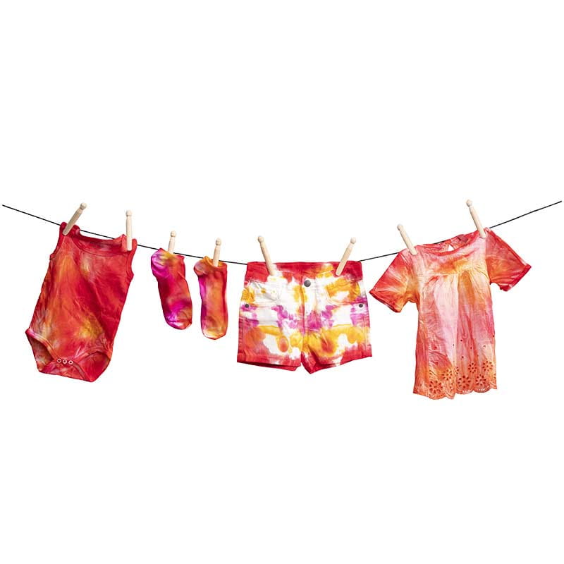 Twórz zabawne, kolorowe wzory, takie jak spirale, gwiazdki, ombré i inne, po prostu przekręcając i wiążąc materiał gumkami lub klipsami i nakładając różne kolorowe barwniki. Gotowe do użycia farby dostępne są w butelkach z precyzyjnymi dozownikami, które umożliwiają równomierne i precyzyjne nakładanie bezpośrednio na tkaninę. W zestawie znajdują się również rękawiczki jednorazowe, które zapobiegną zabrudzeniu dłoni. Po farbowaniu utrwal tkaninę żelazkiem, aby zachować intensywne kolory.