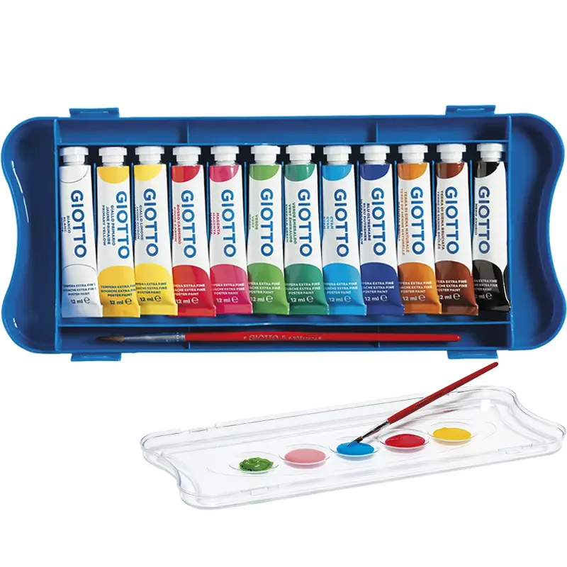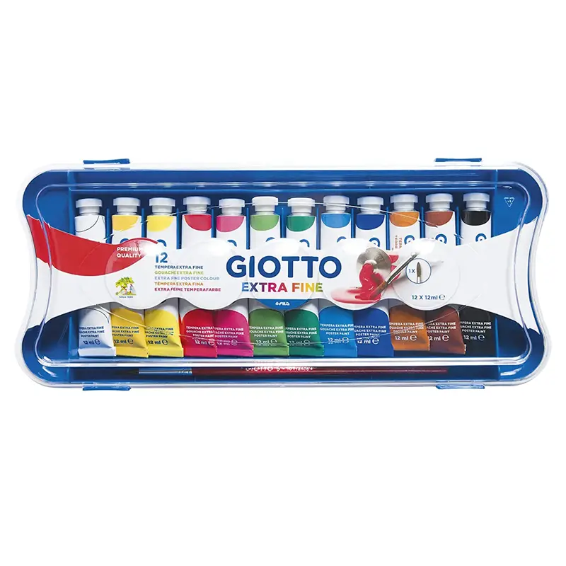 Zestaw 12 farb temperowych Giotto Extra Fine w aluminiowych tubkach po 12 ml. Farby na bazie wody zamknięte w wygodnym plastikowym etui, którego wieko pełni rolę palety do mieszania kolorów. W zestawie znajduje się okrągły pędzel.