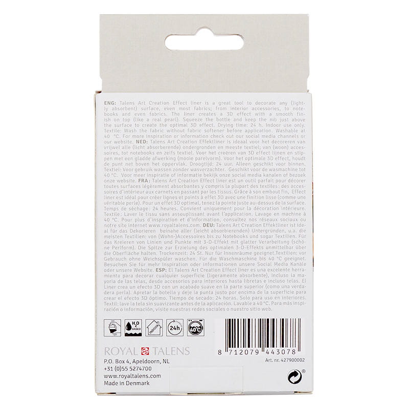 Effect Liner to konturówka umożliwiająca tworzenie trójwymiarowych linii i kropek na różnych chłonnych powierzchniach, w tym na tekstyliach, dostępna w 49 różnych kolorach i efektach, takich jak perłowe, połyskujące, brokatowe i neonowe, co pozwala na różnorodne dekoracje.