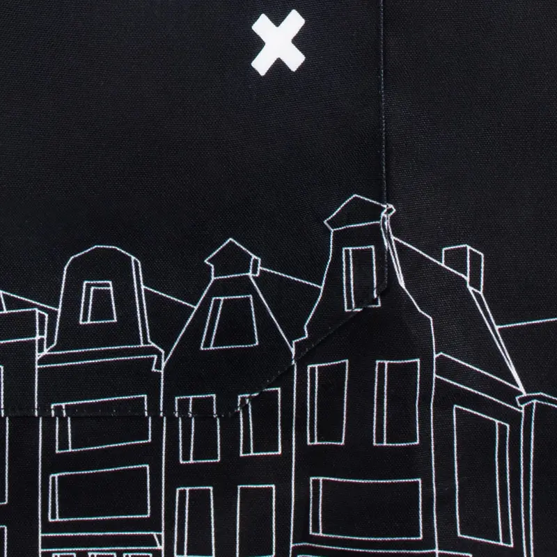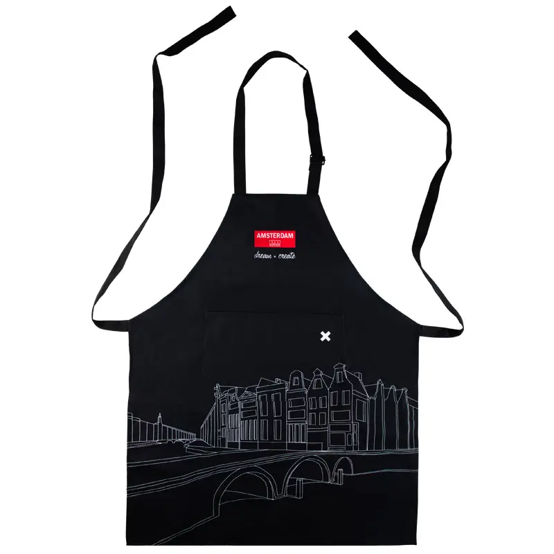 Zakładany przez głowę i wiązany z tyłu. Regulacja paska fartucha na szyi przy pomocy sprzączki, umożliwiają dopasowanie do różnych sylwetek. Ozdobiony logiem marki Amsterdam i napisem Dream x Create oraz rysunkiem graficznym przedstawiającym kamienice i mosty miasta Amsterdam. Fartuch można prać w pralce.