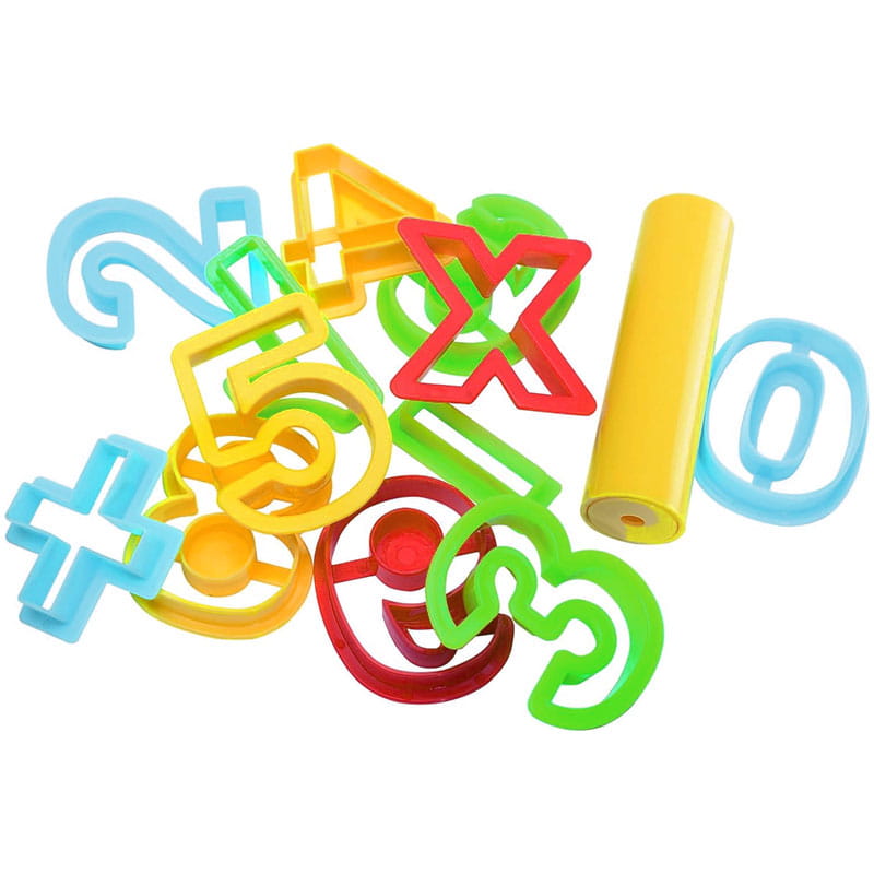 Zestaw 15 kolorowych foremek w kształcie cyferek. Wykonane z trwałego tworzywa sztucznego, posiadają zaokrąglone krawędzie zapewniające bezpieczeństwo dla dziecięcych rączek. W zestawie znajduje się również wykonany z tworzywa sztucznego wałek umożliwiający rozwałkowanie masy.
