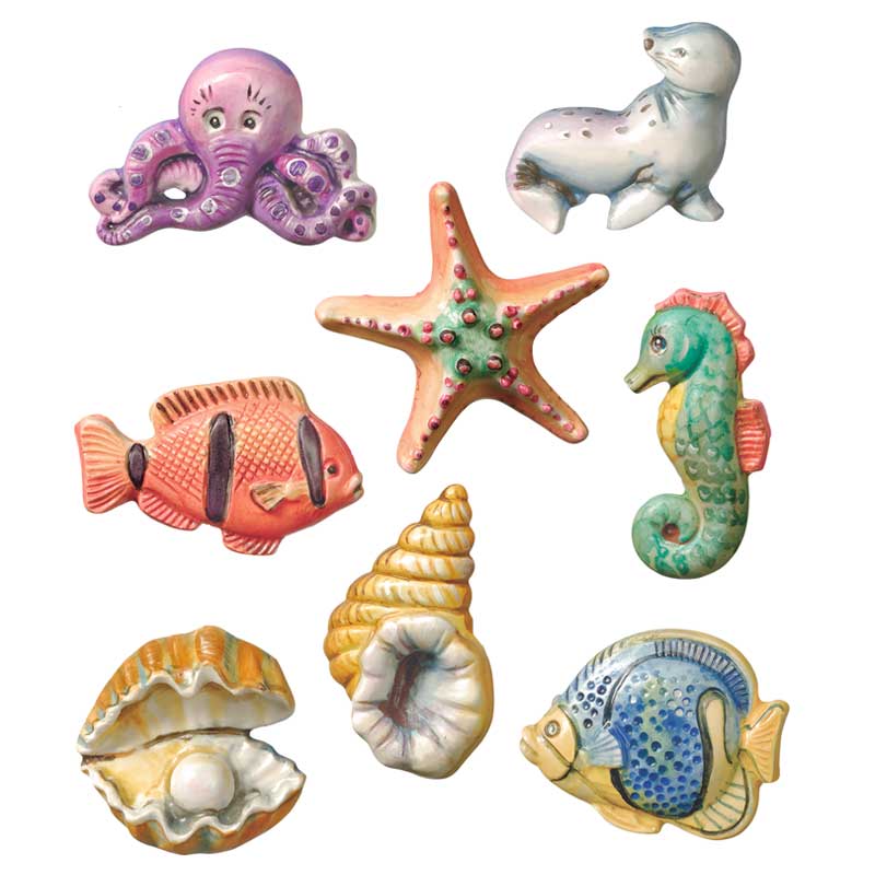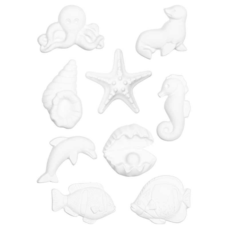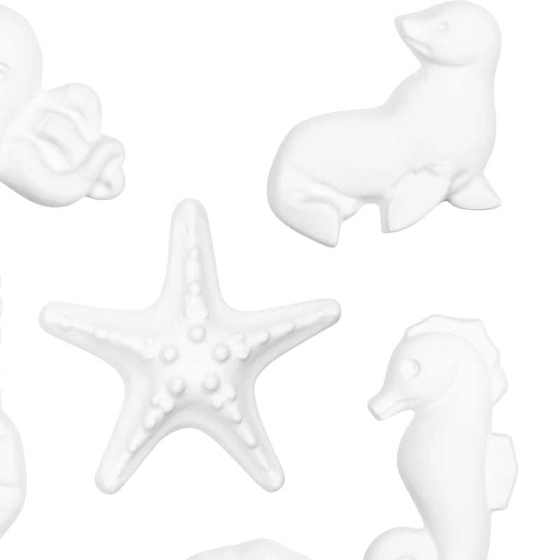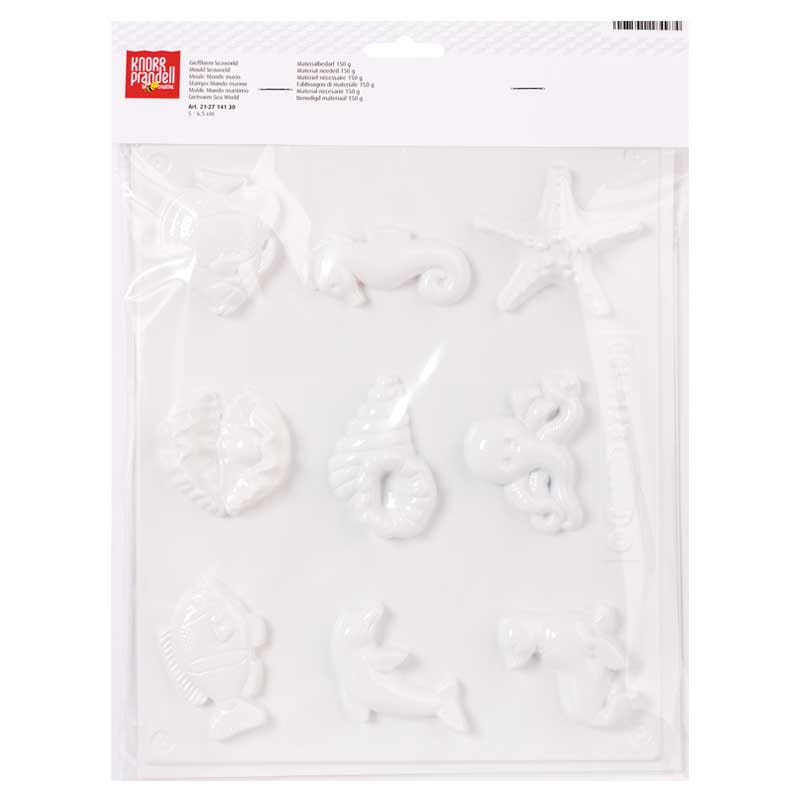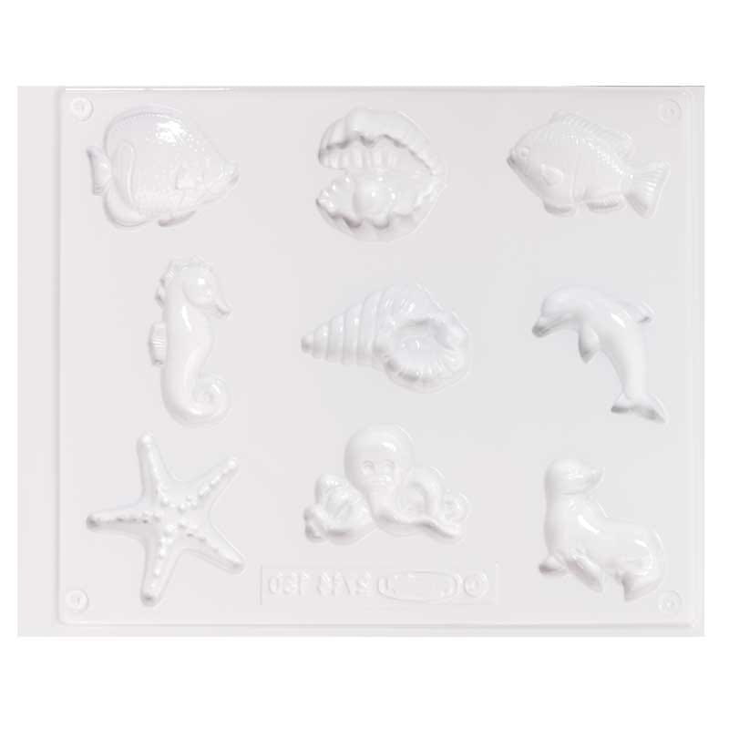 Foremka wielokrotnego użytku, wykonana z trwałego tworzywa sztucznego. 9 motywów z morskimi stworzeniami - ryb, delfina, foki ośmiornicy, muszli i małży.