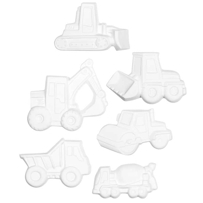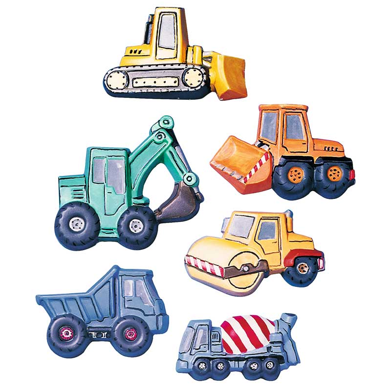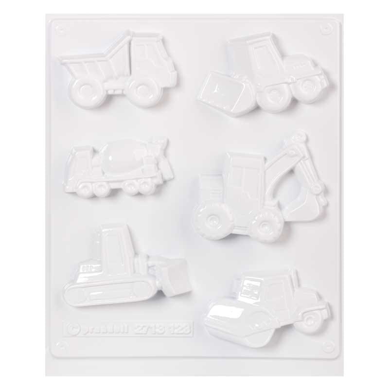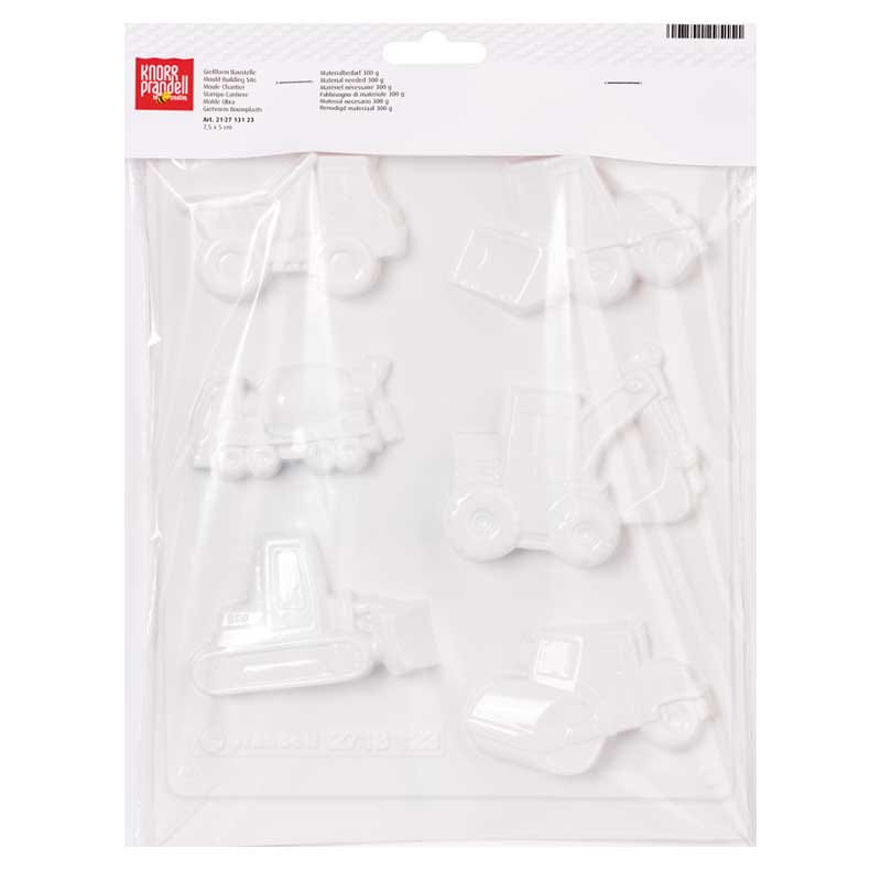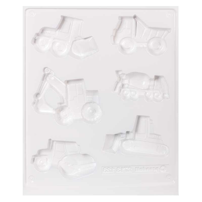 Foremka wielokrotnego użytku, wykonana z trwałego tworzywa sztucznego. 6 motywów z pojazdami budowlanymi.