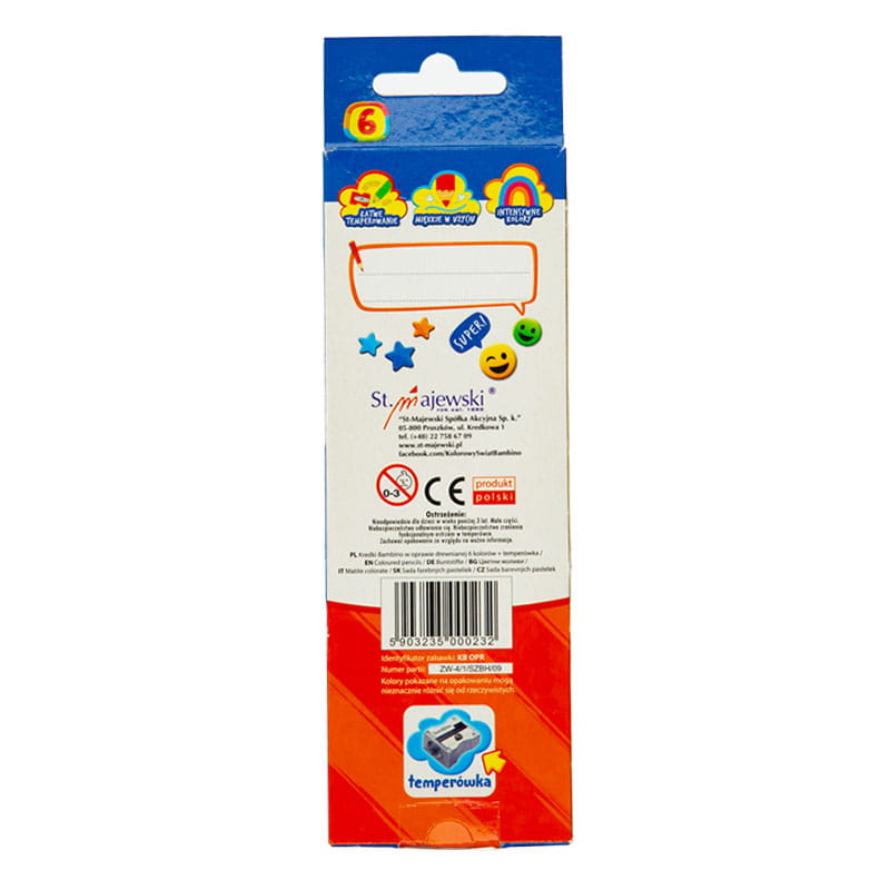 Odpowiednie dla dzieci od 3 roku życia, kredki BAMBINO przestrzegają rygorystycznych norm bezpieczeństwa i spełniają wymagania dyrektyw europejskich.