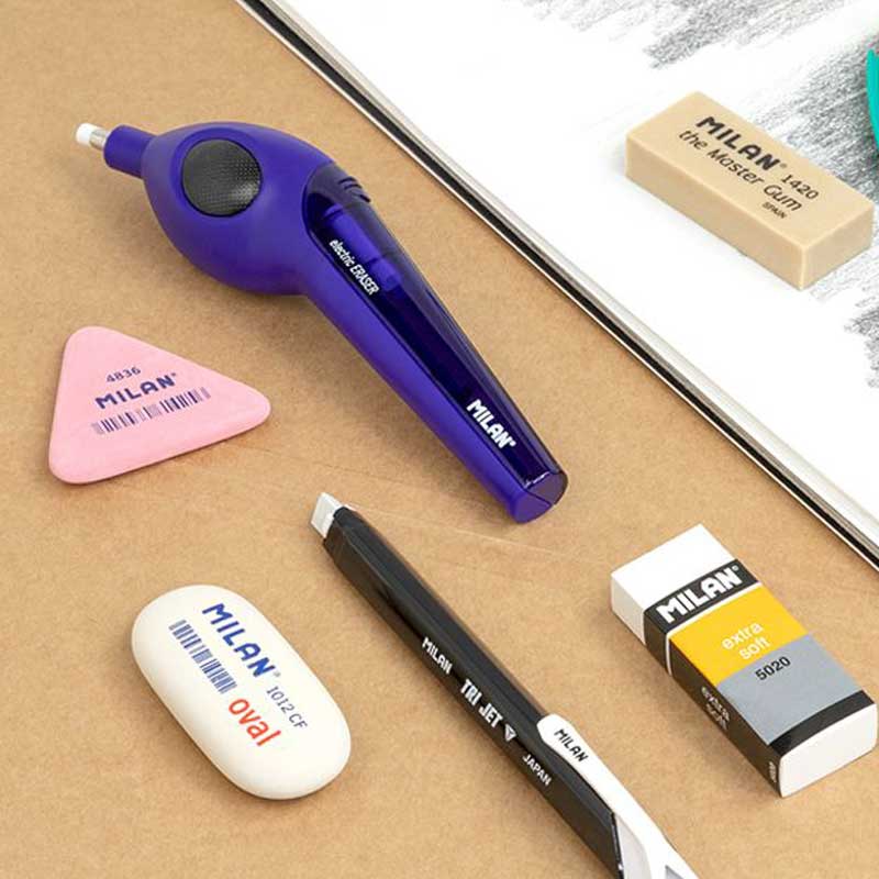 Gumka elektryczna Milan Acid jest bardzo prosta w użyciu – wystarczy, że naciśniesz przycisk i delikatnie przyłożysz gumkę do powierzchni, którą chcesz wymazać. Odpowiedni nacisk gwarantuje płynną pracę, a wbudowany mechanizm zatrzymuje gumkę przy zbyt silnym docisku, chroniąc przed uszkodzeniem papieru.