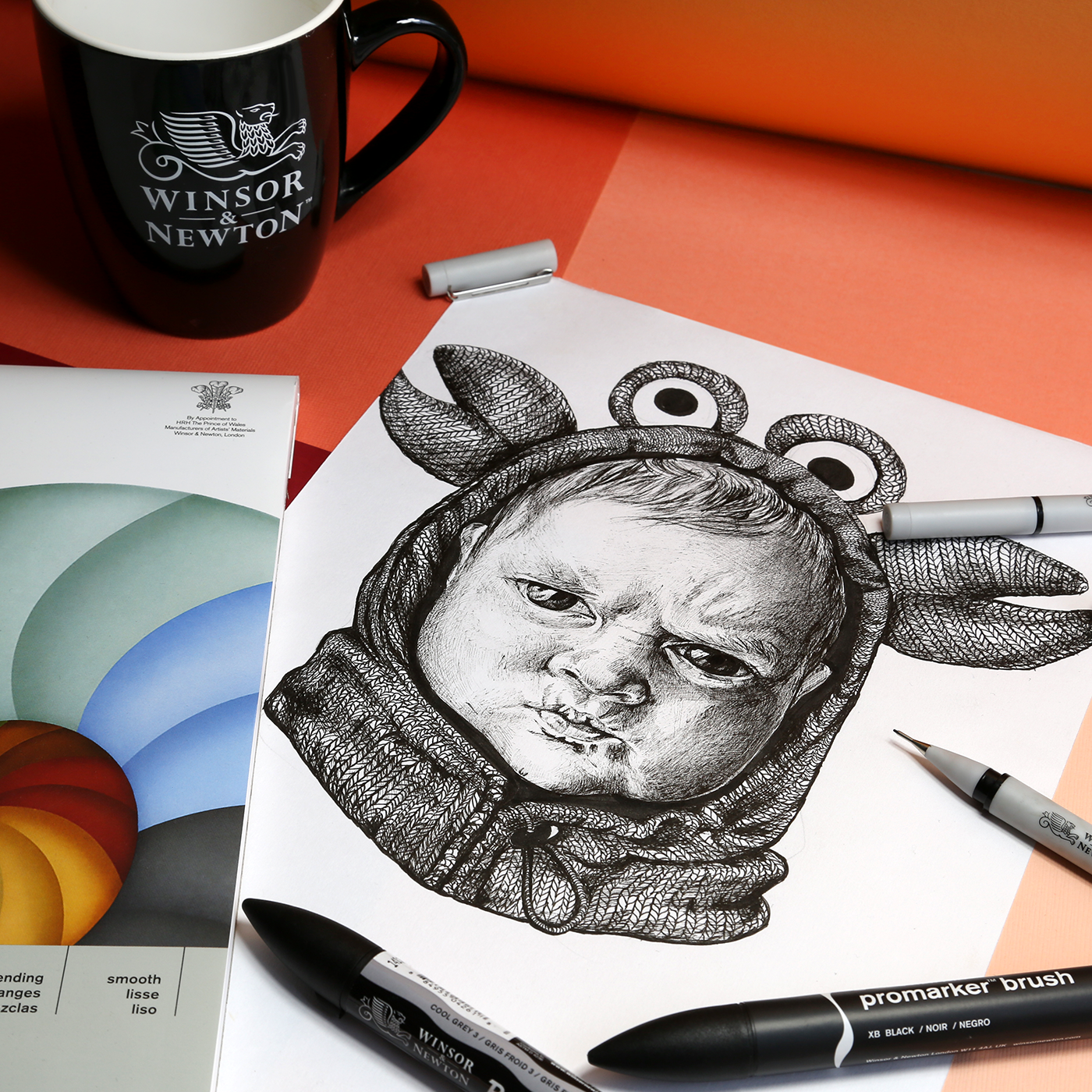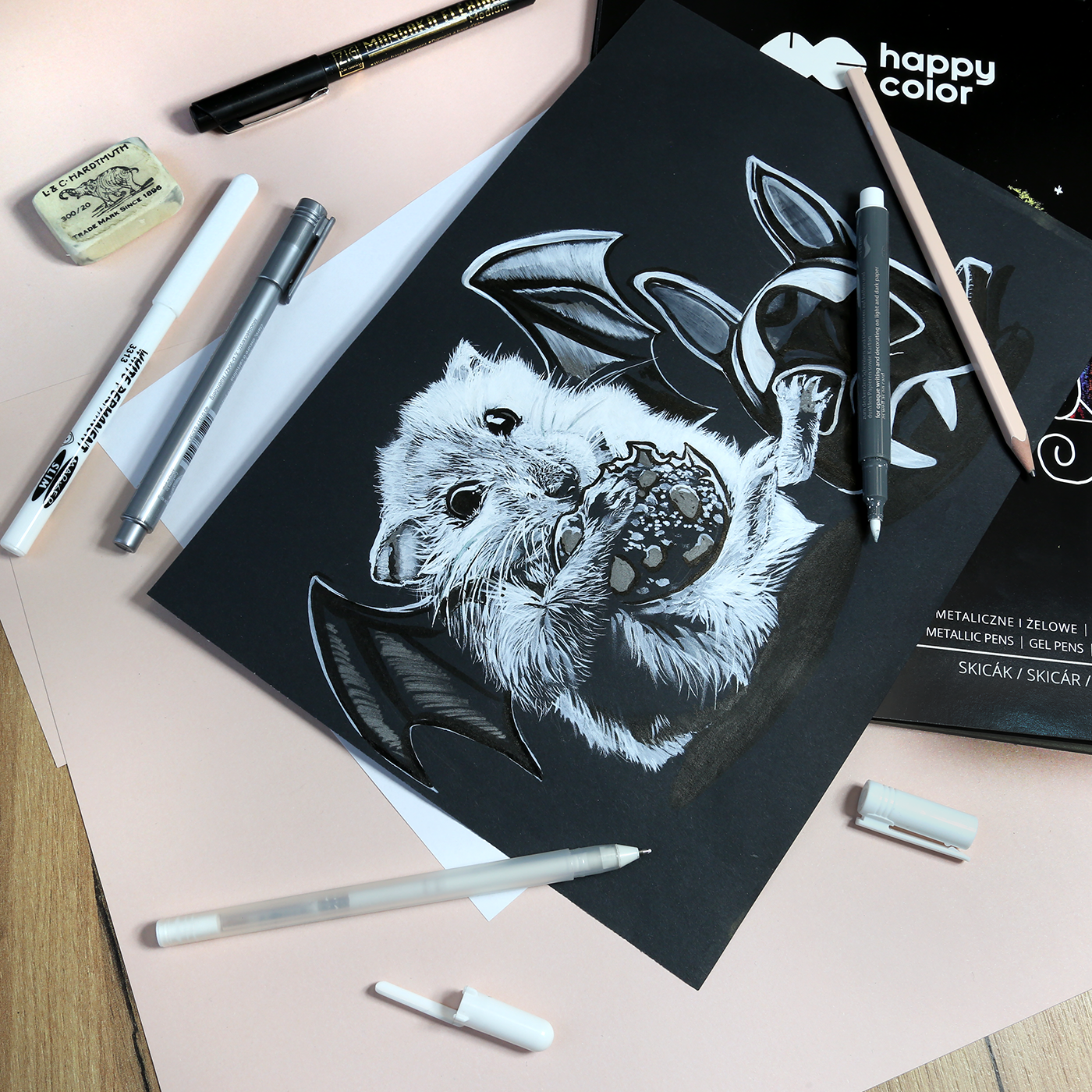 Zestaw doskonały, zawiera wszystko co do tego typu prac jest potrzebne. Znajdziecie tam: pisak z „podwójną funkcją” końcówką do precyzyjnych cienkich linii, niczym włoski u naszego chomika leżącego w snakach, jak i grubszą końcówką do narysowania solidnej miski na te przysmaki. Pisak z końcówką pędzelkową świetnie sprawdził się do zarysowania wielu smakowitości. Szary pisak w zestawie nadaje głębi i smaku każdemu „chrupkowi”. A Clean doda blasku każdemu elementowi pracy.
