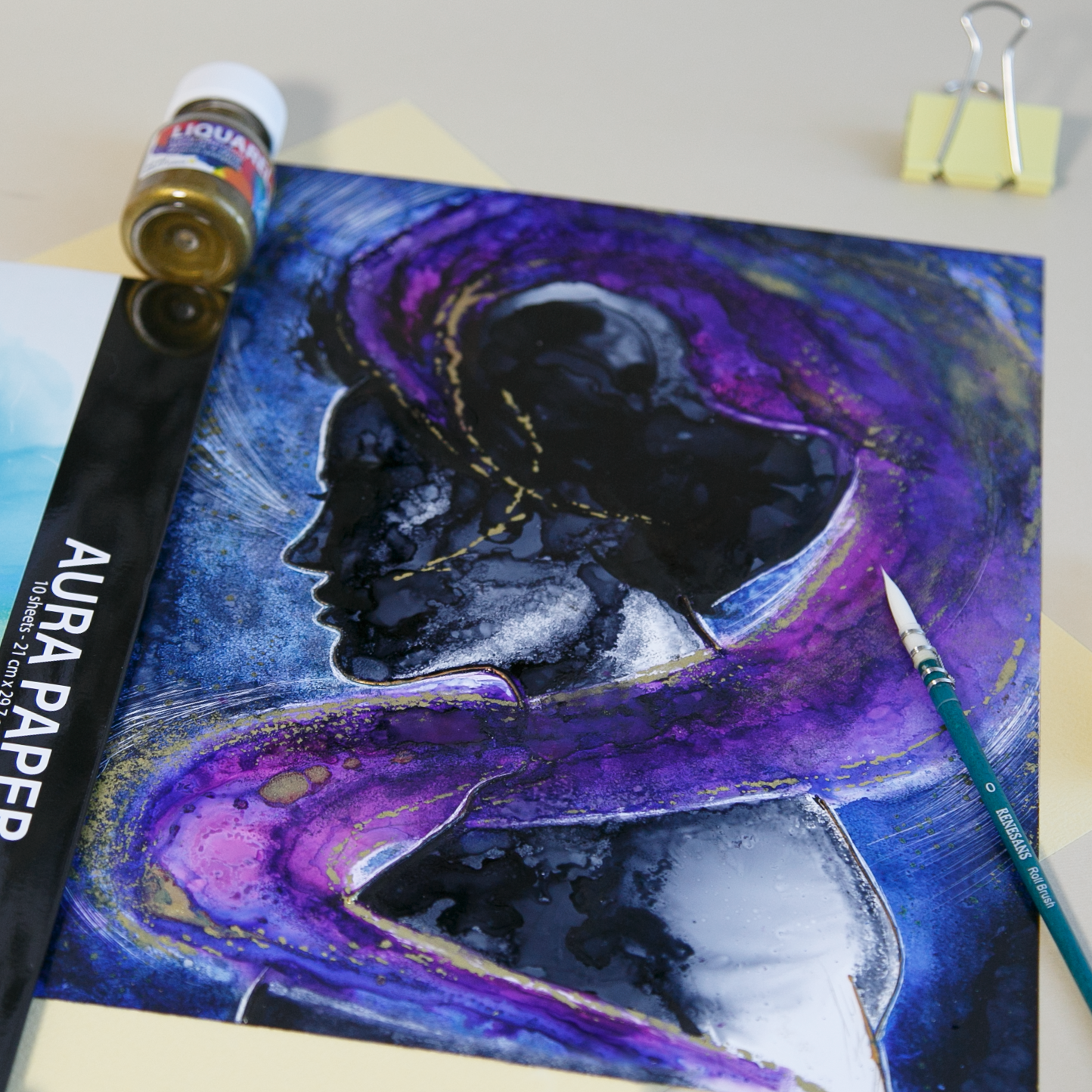 Stworzone do raczej nieposkromionego ekspresyjnego wyrazu, abstrakcyjnych plam łączących się kolorów próbowaliśmy tym razem okiełznać i nam się to udało. Zabawa nimi sprawiła nam wiele radości i zainspirowała do dalszego eksperymentowania. Dedykowane do niej media pomagają w uzyskaniu efektów jakie sobie wymarzyliśmy. Rozpuszczalnik pomógł uzyskać jaśniejsze tony, a zagęstnik ciemniejsze. Kontur pracy uzyskaliśmy dzięki nożykowi - zeskrobując farbę z pracy. Ciekawe efekty można również uzyskać delikatnie zwilżając gąbkę rozpuszczalnikiem – powstają wtedy małe jaśniejsze plamki. Przy kolejnej pracy „Ego” postanowiliśmy eksperymentować dalej i dodać soli gruboziarnistej by stworzyć galaktykę. Zachęcamy do zabawy tymi tuszami!
