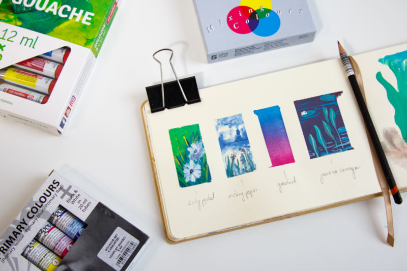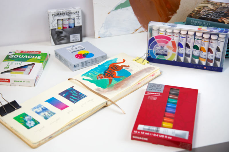 - papier - choć gwasze sprawdzają się nawet w wielu sketchbook'ach, to do nauki polecamy bloki akwarelowe lub mix media. Posiadają większą gramaturę, dzięki czemu lepiej wchłaniają farby bez efektu pofalowania (szczególnie jeśli malujemy laserunkowo).