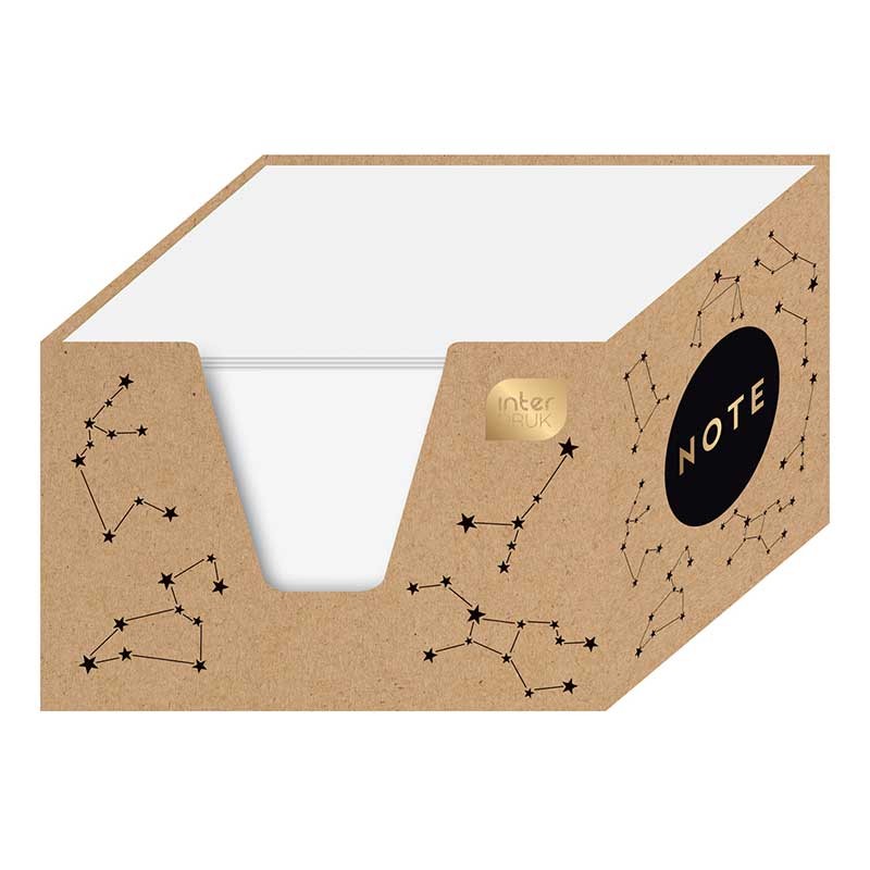 Karteczki biurowe Interdruk Kraft w białym kolorze są zapakowane w elegancki kubik z trwałego kartonu o gramaturze 250 g/m2 ozdobiony złotymi detalami w technologii hot-stamping. Kraftową tekturkę zdobią również obrazki gwiazdozbiorów.