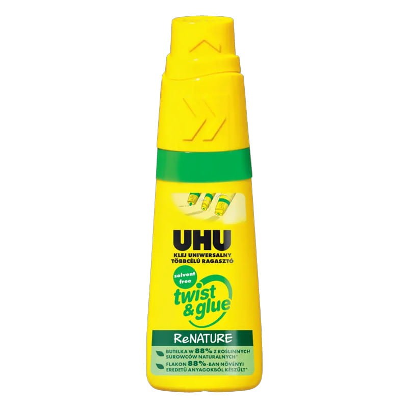 UHU Klej uniwersalny twist & glue ReNATURE to ekologiczny produkt stworzony z myślą o ochronie środowiska. Jego formuła oparta jest w 70% na naturalnych składnikach, co sprawia, że jest przyjazny dla użytkowników i planety. Butelka kleju wykonana jest z 88% surowców roślinnych, co dodatkowo zmniejsza emisję CO2 i oszczędza zasoby kopalne. Unikalny aplikator „twist” umożliwia precyzyjne nakładanie kleju w formie kropek, linii lub na większych powierzchniach, co czyni go wszechstronnym w użyciu. Produkt jest bezpieczny, bezrozpuszczalnikowy, dermatologicznie przebadany i zmywalny mydłem, a ponadto można go ponownie napełniać. Idealnie nadaje się do klejenia papieru, kartonu, tkanin, drewna, a nawet szkła czy metalu, jednak nie jest odpowiedni do fotografii, polietylenu (PE) i polupropylenu (PP).