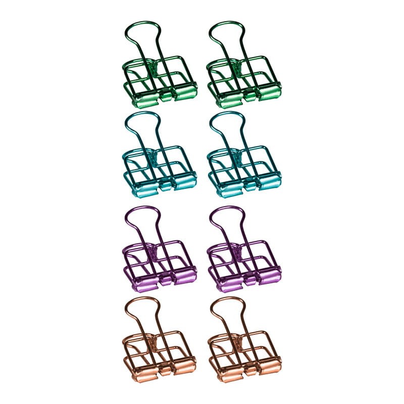 Wielkość klipsa 19 mm, opakowanie zawiera 8 klipsów w kolorach: zielony, niebieski, fioletowy, miedziany.