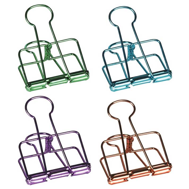 Wielkość klipsa 50 mm, opakowanie zawiera 4 klipsy w kolorach: zielony, niebieski, fioletowy, miedziany.