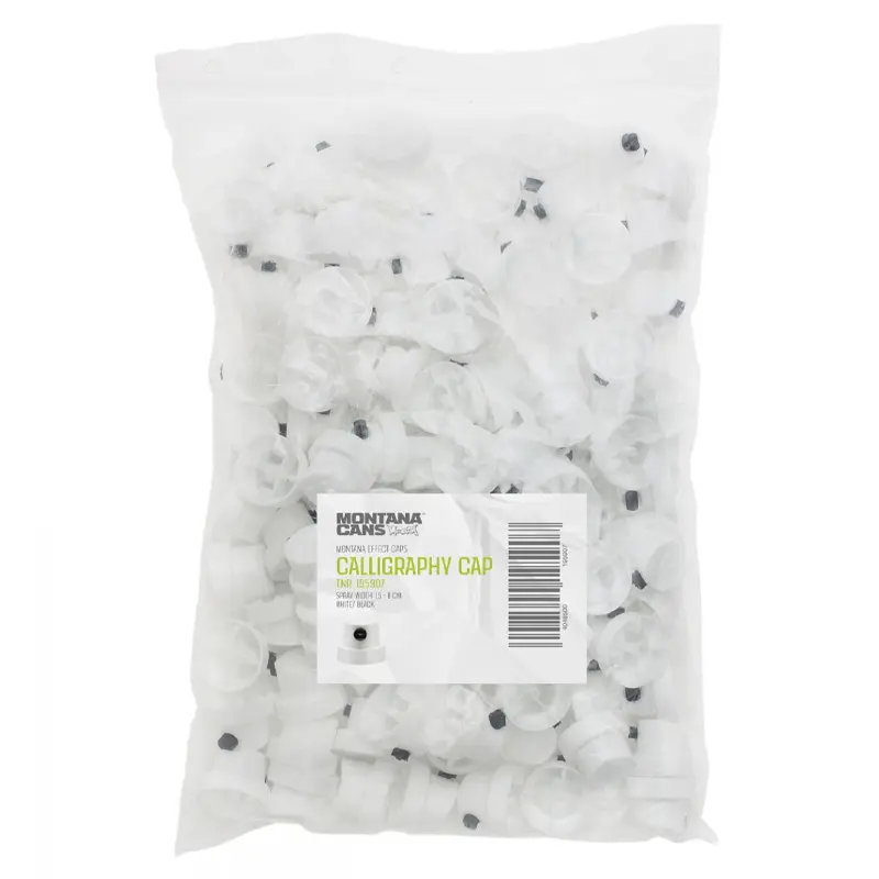 Calligraphy Cap to specjalna dysza, która generuje efekt linii kaligraficznej, przypominających ślady markerów lub pędzli kaligraficznych, ale przy użyciu farby aerozolowej. Jest to nowoczesna wersja tradycyjnych dysz chisel caps stosowanych na puszkach z zaworem męskim. W odróżnieniu od standardowych okrągłych dysz Calligraphy Cap posiada regulowaną kropkę, którą można obracać, co pozwala zmienić prostokątny ślad rozpylania z pionowego na poziomy. Dzięki średniej szerokości rozpylania wynoszącej od 1,5 cm do 8 cm dysza ta sprawdza się w różnych technikach – od aerosolowej kaligrafii, przez wypełnianie i tagowanie, aż po tworzenie unikalnych efektów wizualnych. Należy jednak pamiętać, że przy aplikacji farby może dochodzić do kapania. Calligraphy Cap stanowi doskonałą alternatywę dla artystów szukających odmiennego śladu w porównaniu do tradycyjnych, okrągłych dysz, a także świetnie sprawdza się jako standardowa dysza do puszek EFFECT i TECH.