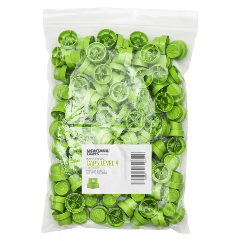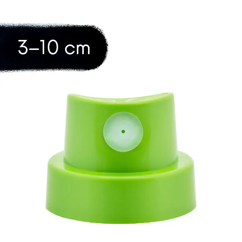 Level 4 Cap to miękka, gruba dysza zaprojektowana do szerokiego rozpylania farby w zakresie od 3 do 10 cm. Doskonale sprawdza się przy wypełnianiu dużych powierzchni, tworzeniu płynnych gradientów oraz szybkim pokrywaniu podłoża. Stanowi wyraźny krok w stronę szerszych linii w porównaniu do cieńszych dysz, zapewniając miękką, gładką i grubą aplikację farby. Dzięki swojej konstrukcji umożliwia uzyskanie płynnych przejść kolorystycznych przy jednoczesnym efektywnym pokrywaniu większych powierzchni w krótszym czasie. Często wykorzystywana przez artystów graffiti do realizacji prac wymagających szybkiego tempa. Szerokość rozpylania zmienia się w zależności od odległości aplikacji – większa odległość pozwala uzyskać szersze linie, natomiast zbyt bliska aplikacja na małych elementach może prowadzić do nadmiernego nałożenia farby lub kapania.