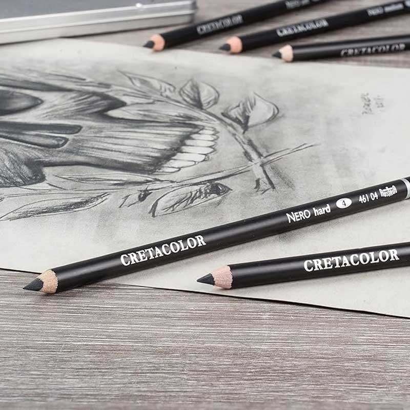 Kredka artystyczna Cretacolor 461 Nero to węgiel drzewny na bazie oleju zamknięty w drewnianej oprawce. Dzięki swojej wyjątkowej formule wyróżnia się kreską o błyszczącym wykończeniu odpornym na zmywanie wodą. Wodoodporne kredki doskonale współpracują z węglem i grafitem, a także z wodnymi mediami w przypadku, gdy potrzebna jest linia, która się nie rozmyje.