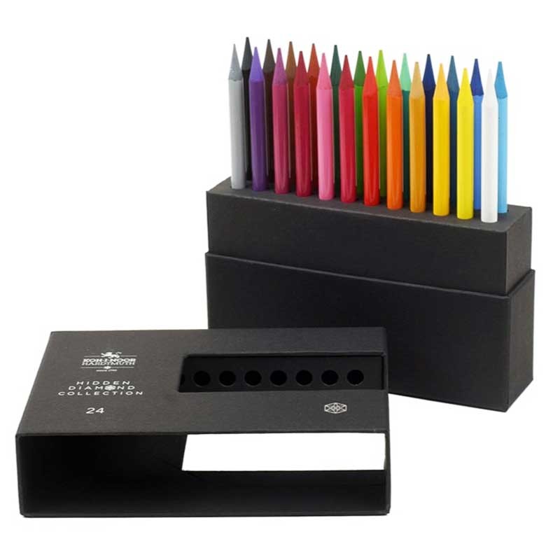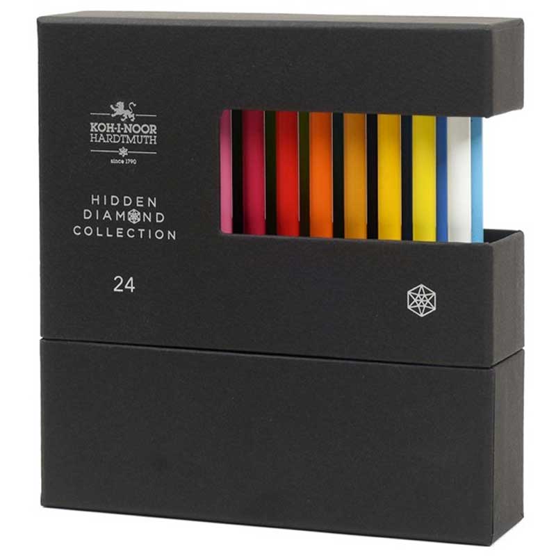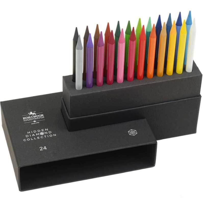 Hidden Diamond Koh-i-noor to luksusowy zestaw zawierający 24 bezdrzewne kredki. Zestaw ten jest spakowany w eleganckie opakowanie inspirowane tradycyjnymi wzorami z pierwszej połowy XX wieku. Opakowanie nie tylko chroni kredki, ale może również służyć jako stylowy i praktyczny stojak na biurko.