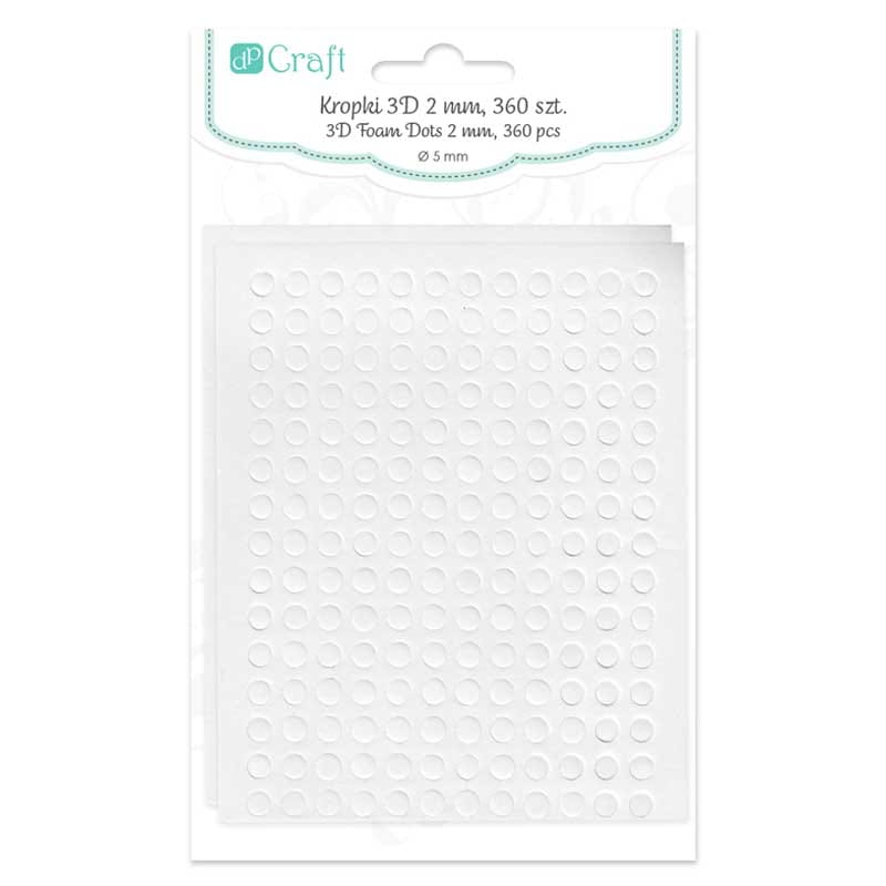 Dwustronna taśma klejąca w formie kółek o średnicy 5 mm wykonana z pianki, dzięki której ma grubość 2 mm. Umożliwia przyklejanie małych elementów dekoracyjnych z papieru i innych tworzyw (np. kryształki, kwiaty itp.), nadając im przestrzennego efektu. Nieoceniona przy tworzeniu kartek okolicznościowych, albumów