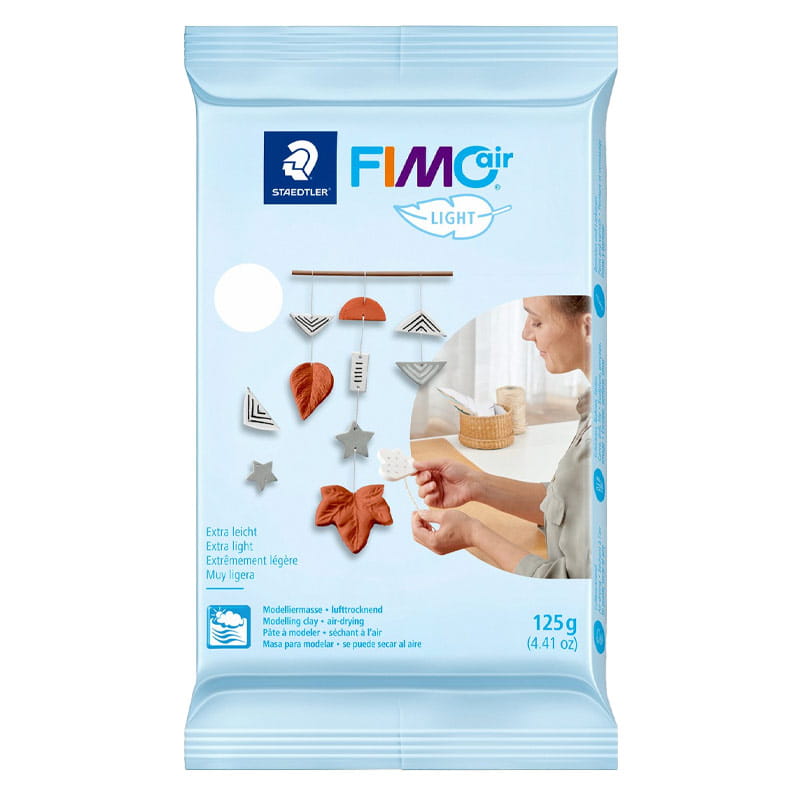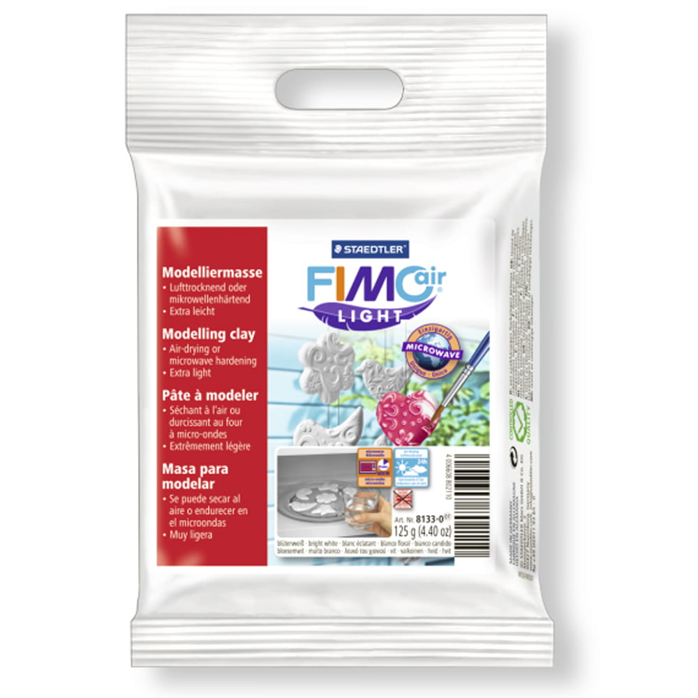 Miękka masa plastyczna idealna do zabawy i prac twórczych. Nie wymaga wypalania – wysycha pod wpływem powietrza w czasie 24 godzin. Po wyschnięciu może być malowana farbami akrylowymi, temperami. Opakowanie z metalicznej folii zabezpiecza glinkę przed wysychaniem, gwarantując stałą, wysoką jakość i długi czas przechowywania. Dowolne wykańczanie – malowanie, lakierowanie, a nawet rzeźbienie, dzięki czemu każdy projekt może być dostosowany do indywidualnych preferencji. Po wyschnięciu przedmioty wykonane z FIMOair Light są trwałe, odporne na pękanie i wyjątkowo estetyczne.