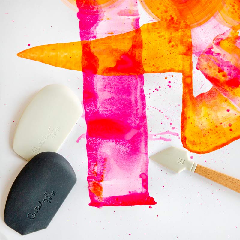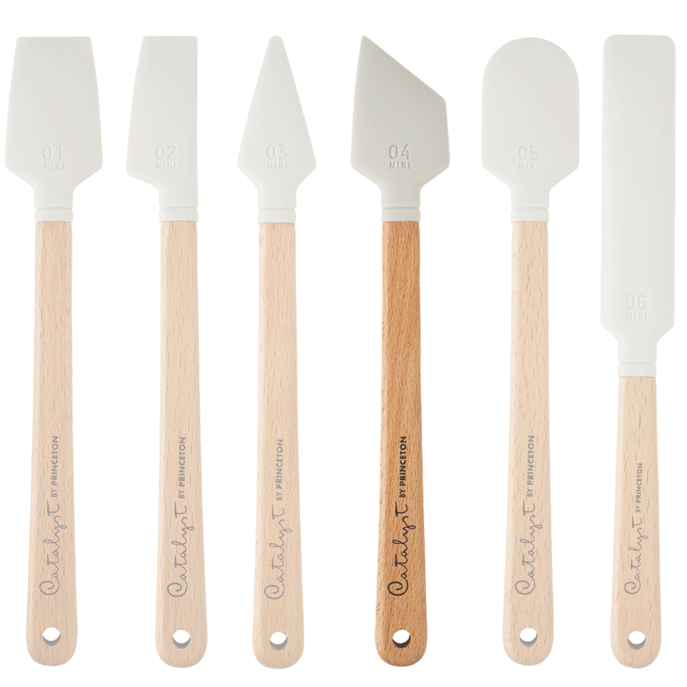 Łopatka Princeton z serii Catalyst Contour wykonana jest z tworzywa sztucznego przypominającego plastik. Jej konstrukcja - połączenie giętkiego sylikonu z drewnianym trzonkiem - pozwala wygodnie ułożyć łopatkę w dłoni i sprawia, że szpatułka łatwo reaguje na nacisk. Konturowane brzegi pozwalają osiągać ciekawe kształty i wzory podczas pracy z farbami i mediami, a także w ceramice, rzeźbie i innych technikach. Łopatka Princeton to narzędzie znajdujące się pomiędzy pędzlem, a nożem malarskim dzięki czemu jest wszechstronna.