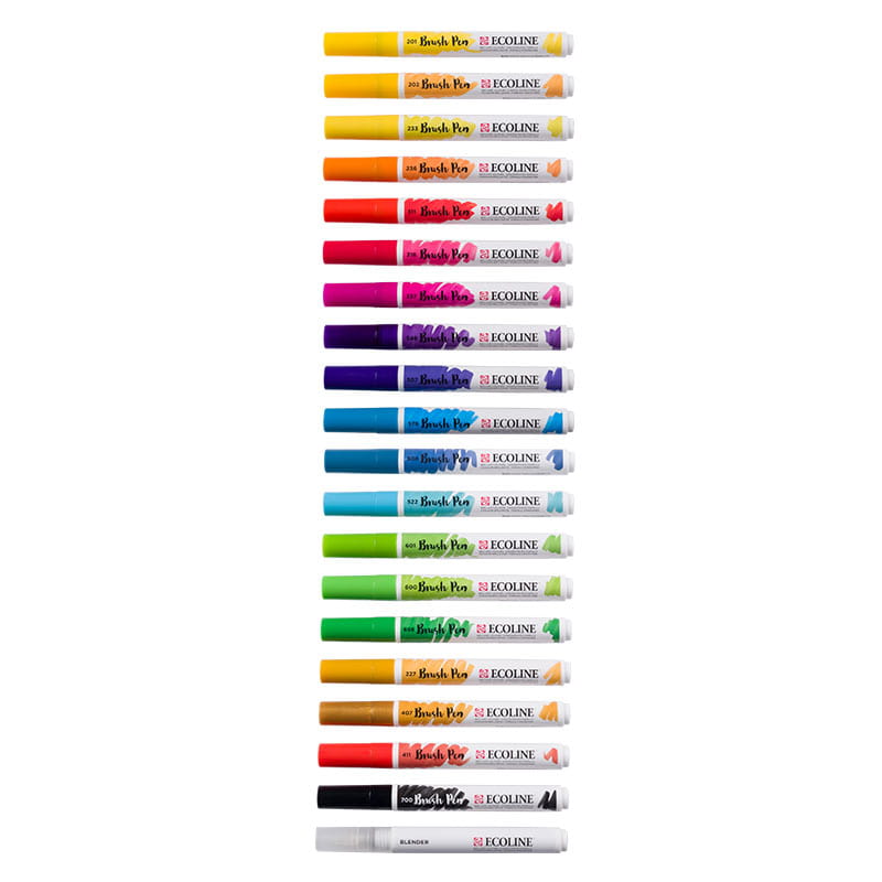 Zamknięta w poręcznym pisaku farba Ecoline zakończona pędzelkiem pozwala na łatwe i wygodne malowanie zarówno cienkich linii, jak i większych powierzchni. Ecoline Brush Pen posiadają bogatą paletę kolorystyczną oraz możliwość ponownego napełnienia pisaka farbami wodnymi Ecoline.